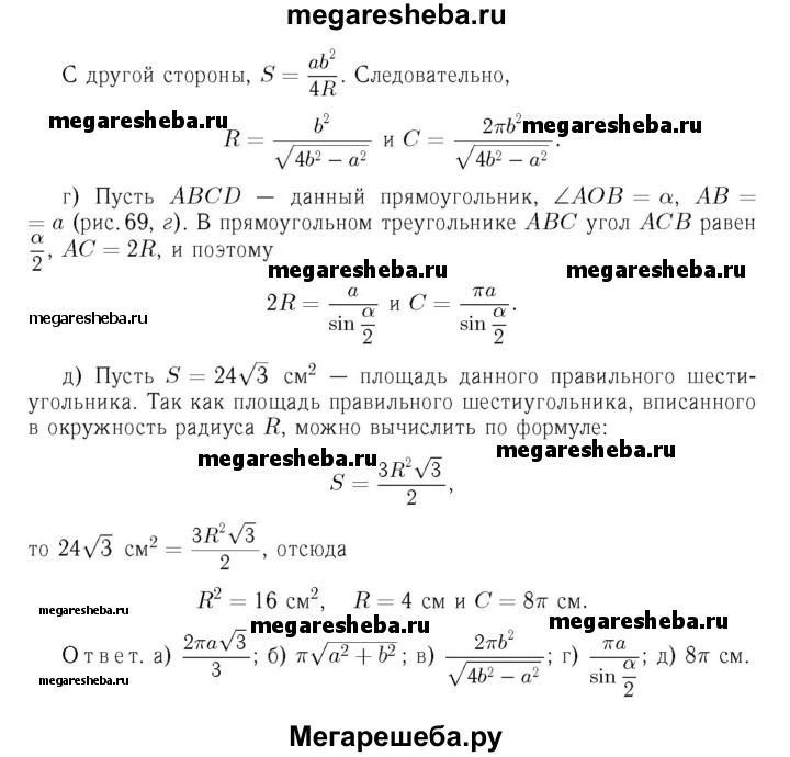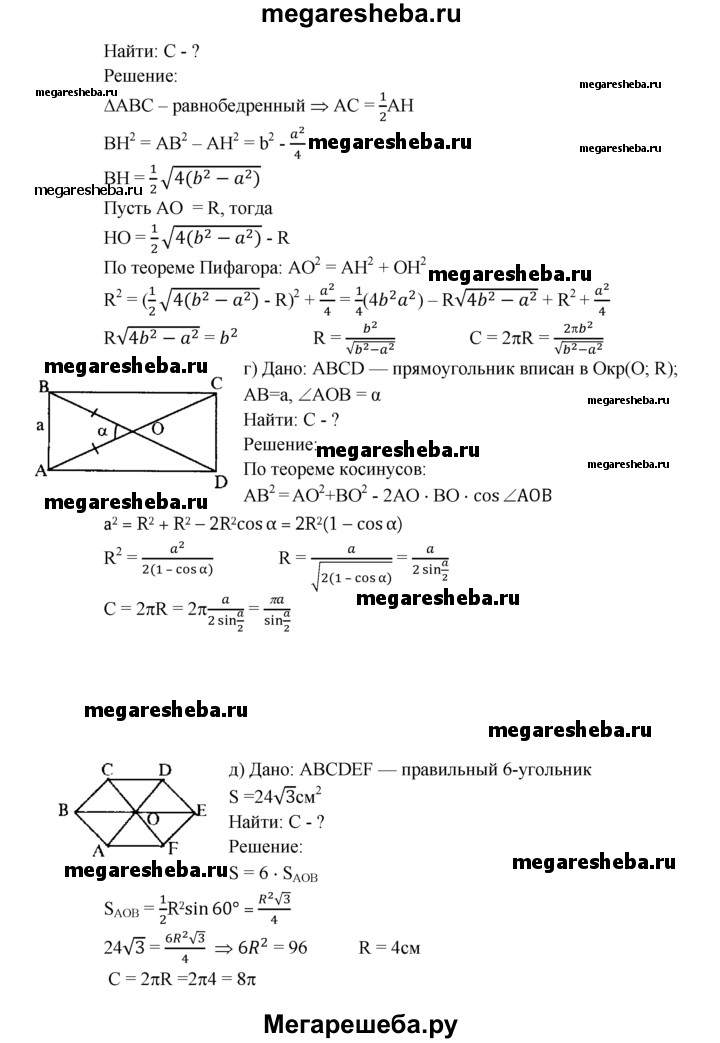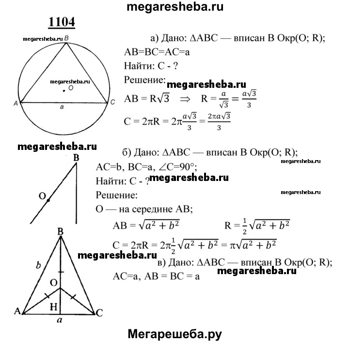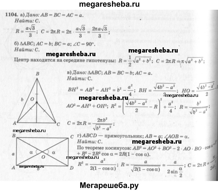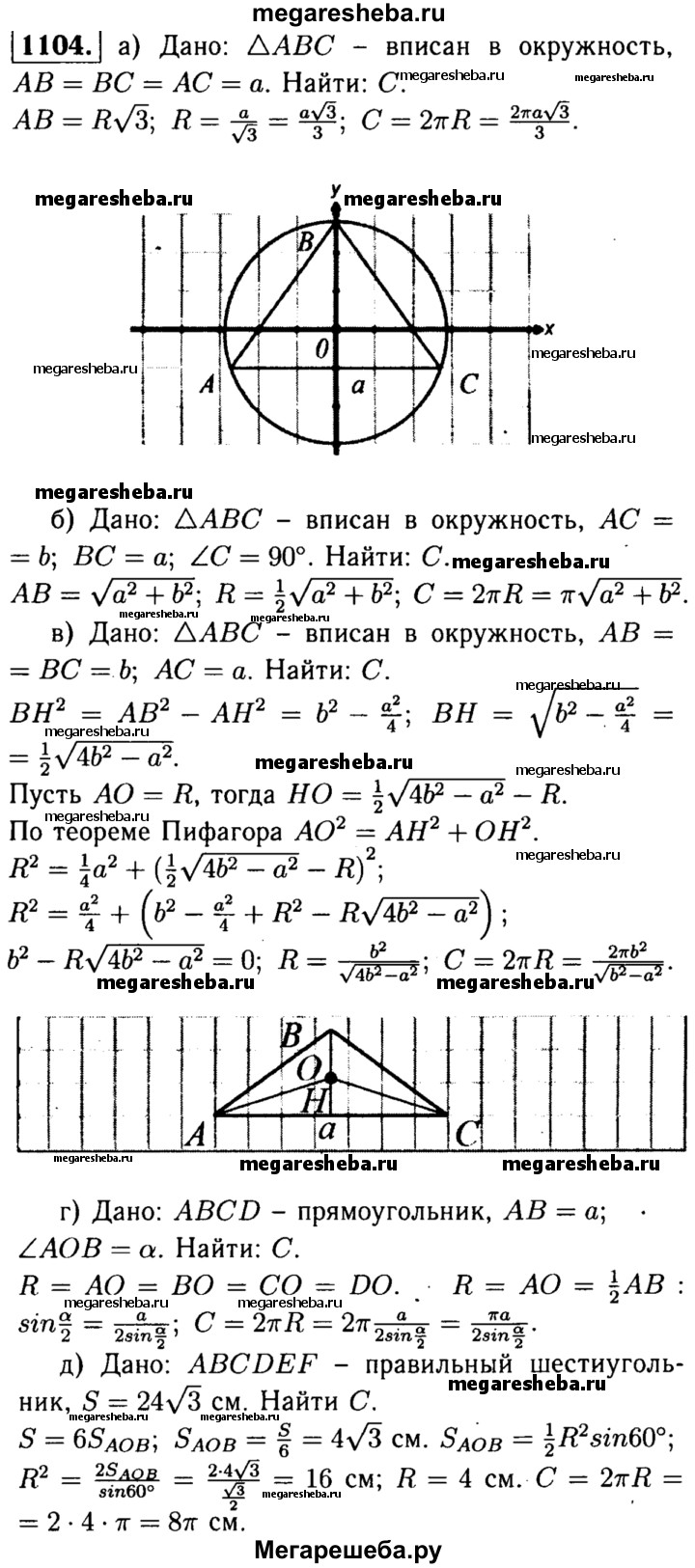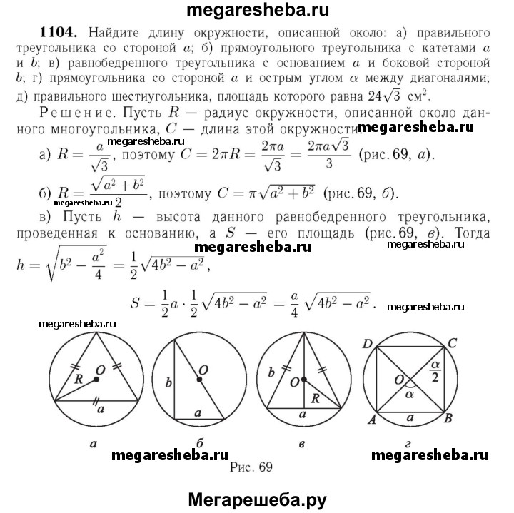 1104 Найдите длину окружности, описанной около: а) правильного треугольника со стороной а; б) прямоугольного треугольника с катетами а и b; в) равнобедренного треугольника с основанием а и боковой стороной b; г) прямоугольника с меньшей стороной а и острым углом а между диагоналями; д) правильного шестиугольника, площадь которого равна 24√3 см2.