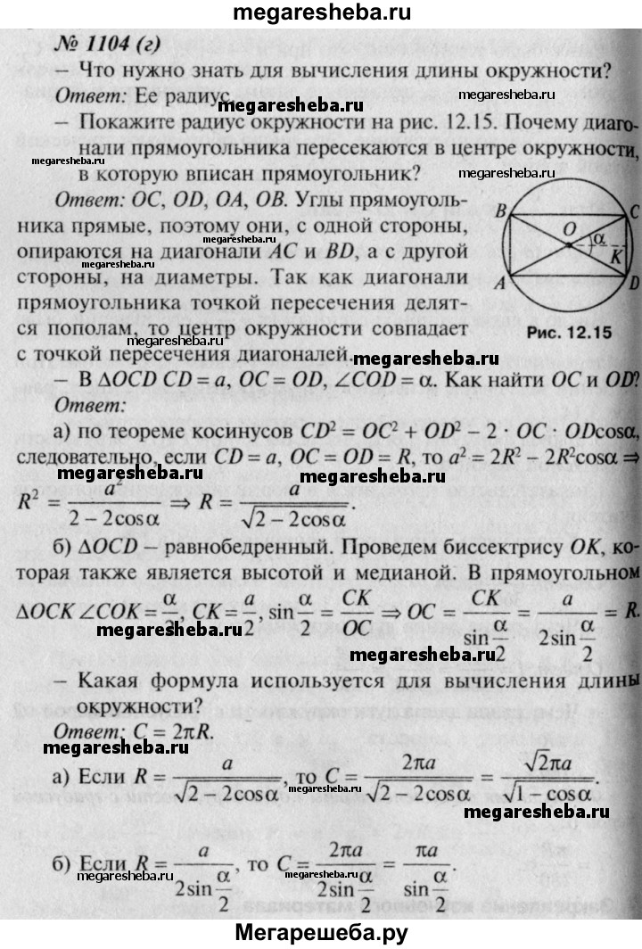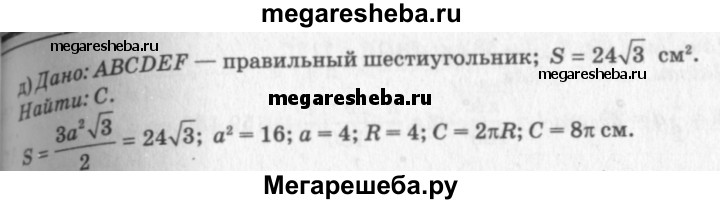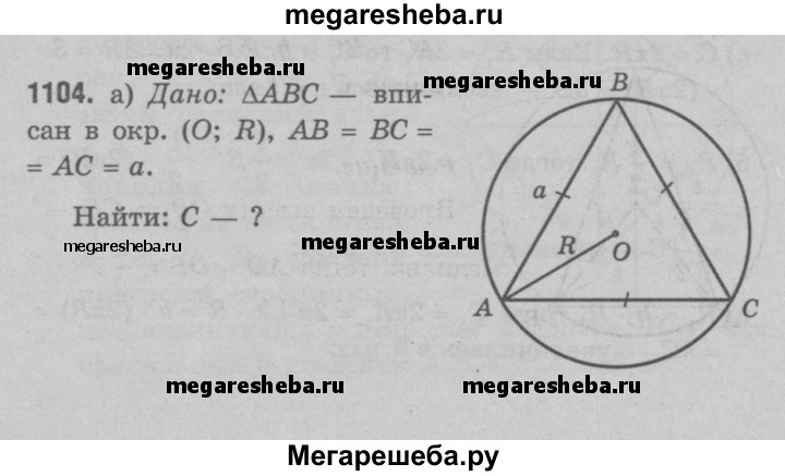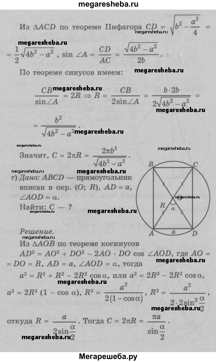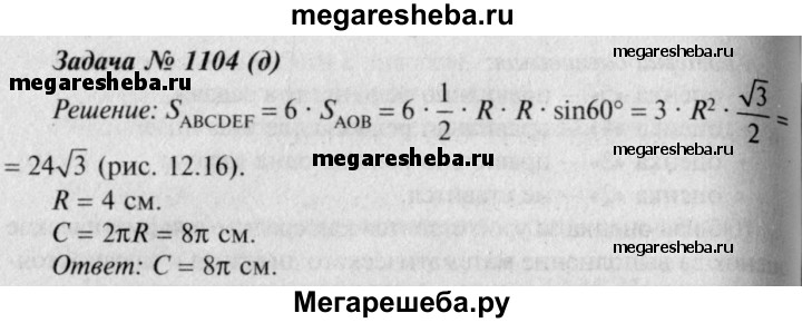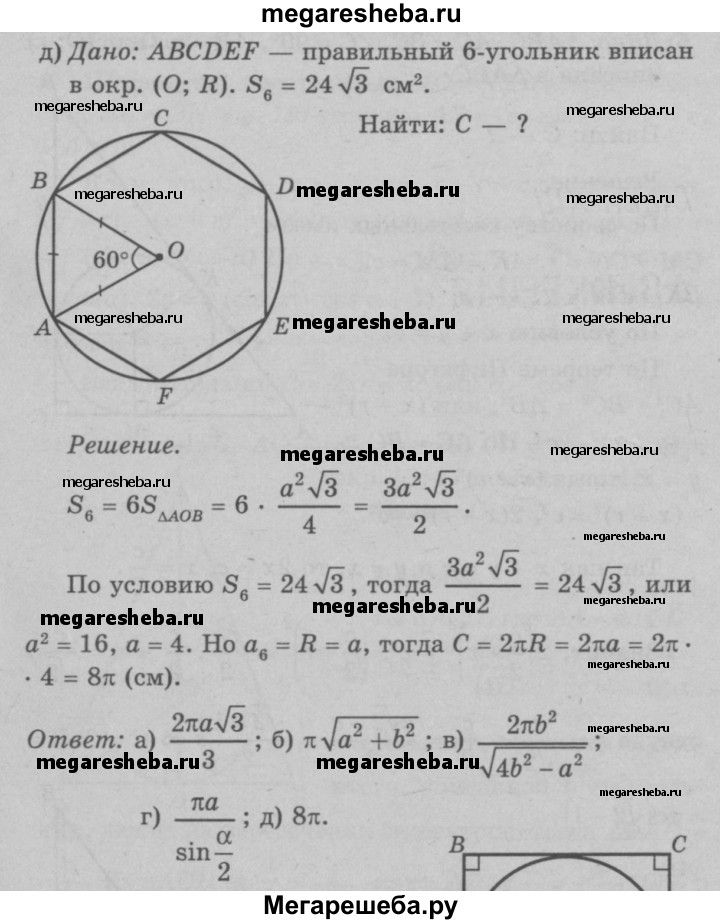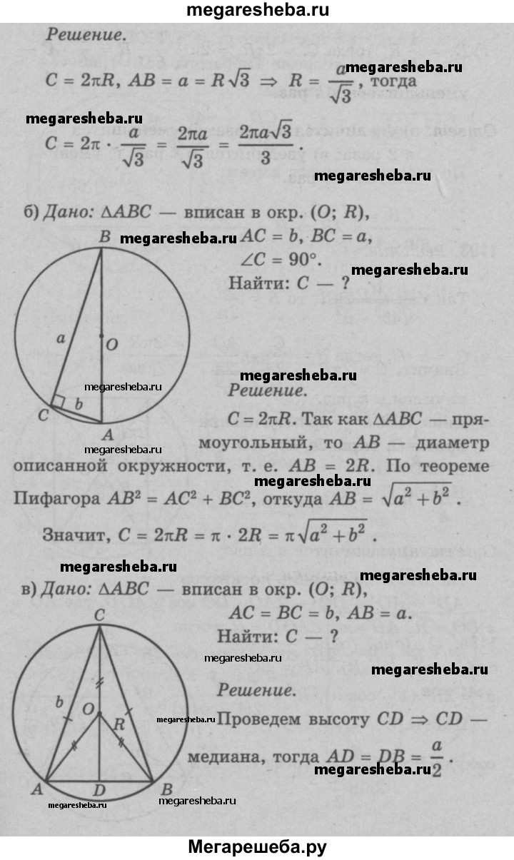 1104 Найдите длину окружности, описанной около: а) правильного треугольника со стороной а; б) прямоугольного треугольника с катетами а и b; в) равнобедренного треугольника с основанием а и боковой стороной b; г) прямоугольника с меньшей стороной а и острым углом а между диагоналями; д) правильного шестиугольника, площадь которого равна 24√3 см2.