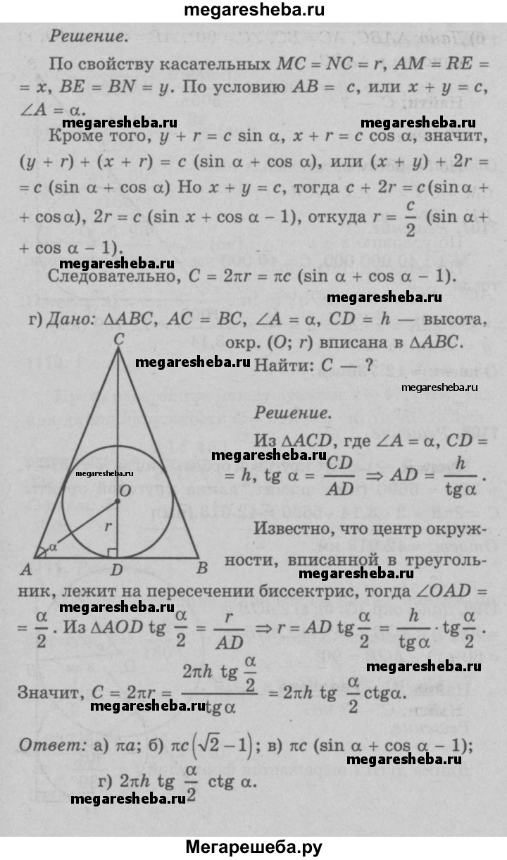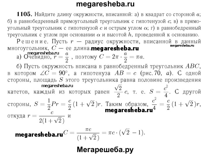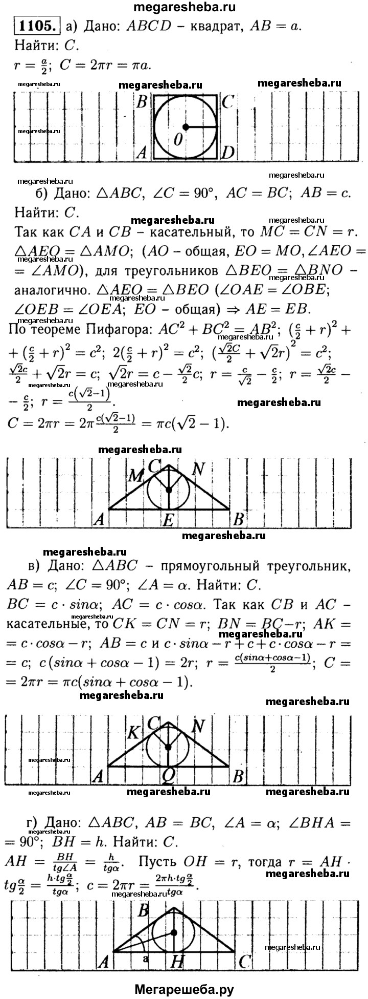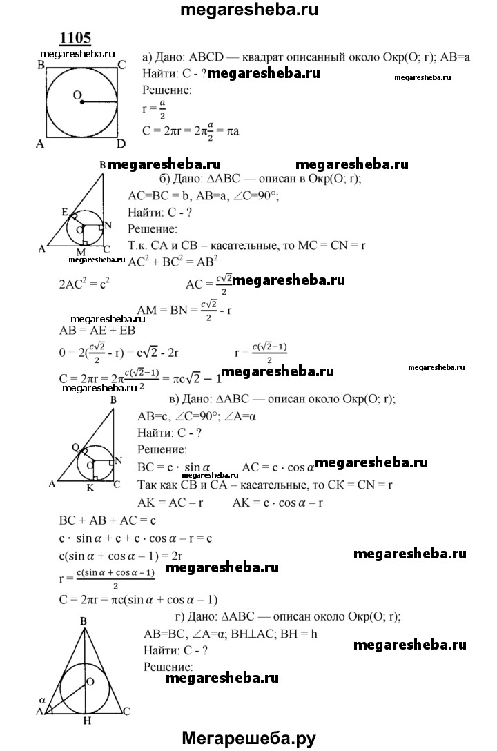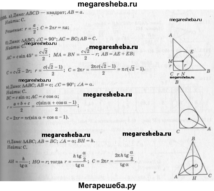 1105 Найдите длину окружности, вписанной: а) в квадрат со стороной а; б) в равнобедренный прямоугольный треугольник с гипотенузой с; в) в прямоугольный треугольник с гипотенузой с и острым углом а; г) в равнобедренный треугольник с углом при основании а и высотой h, проведённой к основанию.
