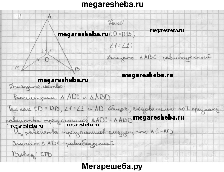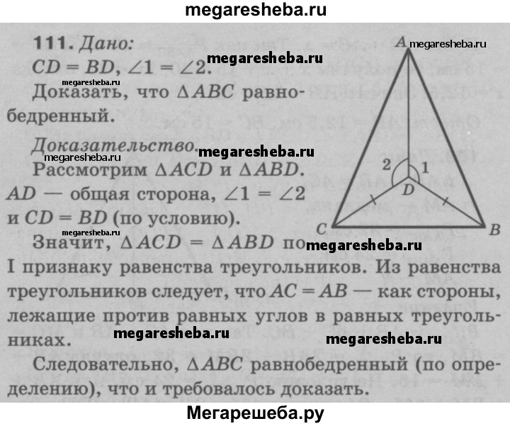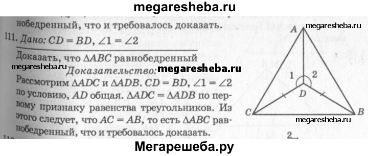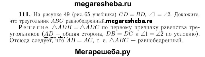 111 На рисунке 65 CD = BD, ∠1 = ∠2. Докажите, что треугольник ABC равнобедренный.