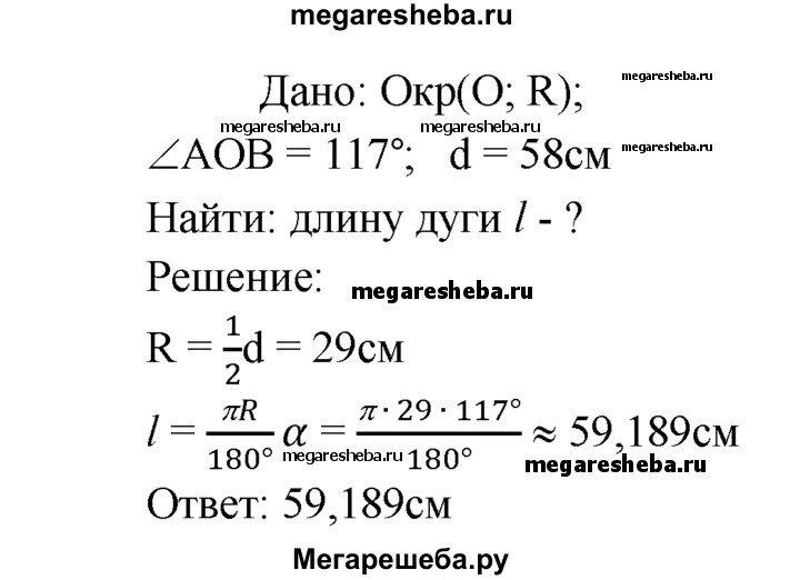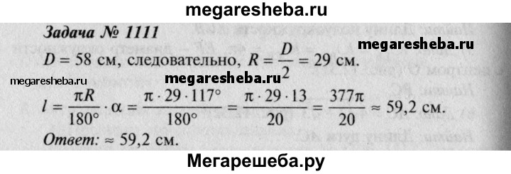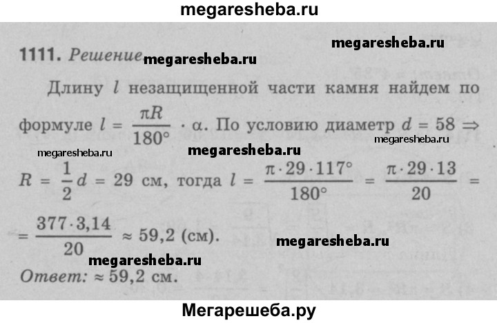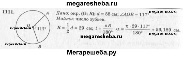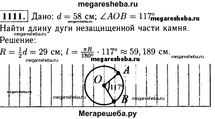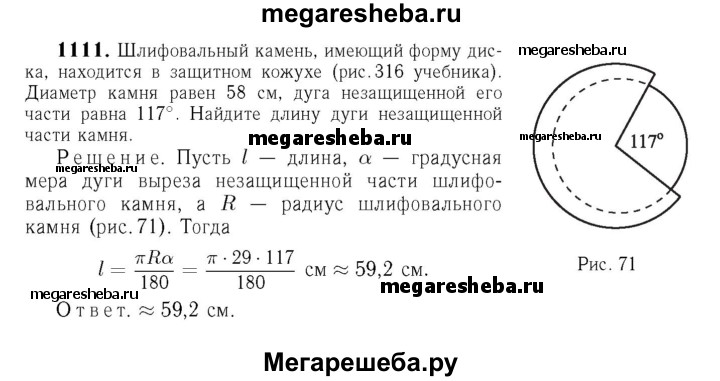1111 Шлифовальный камень, имеющий форму диска, находится в защитном кожухе Рис.316 (рис. 316). Диаметр камня равен 58 см, дуга незащищённой его части равна 117°. Найдите длину дуги незащищённой части камня.