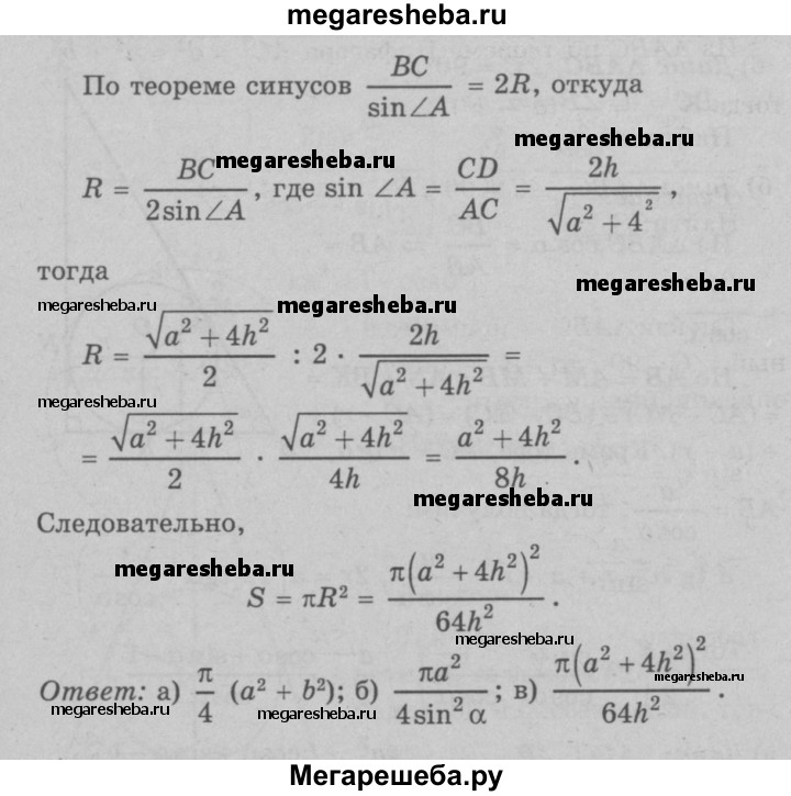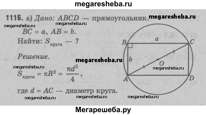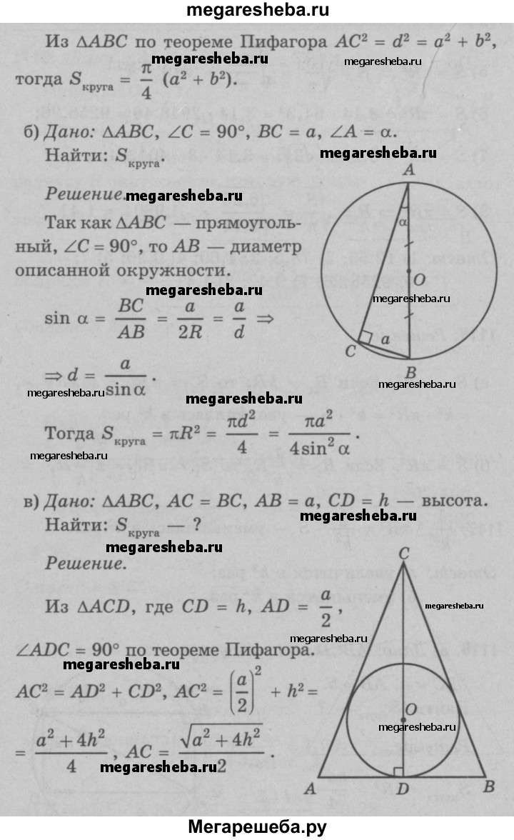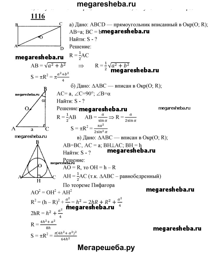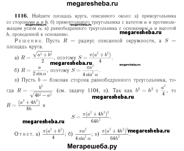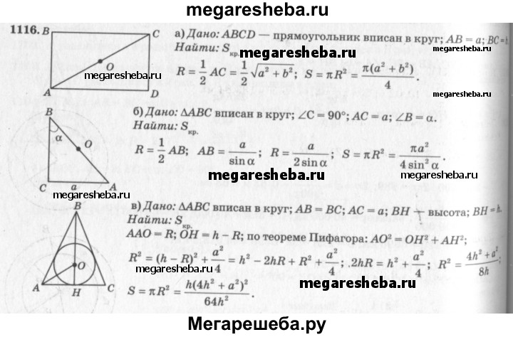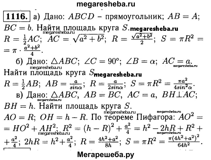 1116 У Найдите площадь круга, описанного около: а) прямоугольника со сторонами а и b; б) прямоугольного треугольника с катетом а и противолежащим углом а; в) равнобедренного треугольника с основанием а и высотой h, проведённой к основанию.