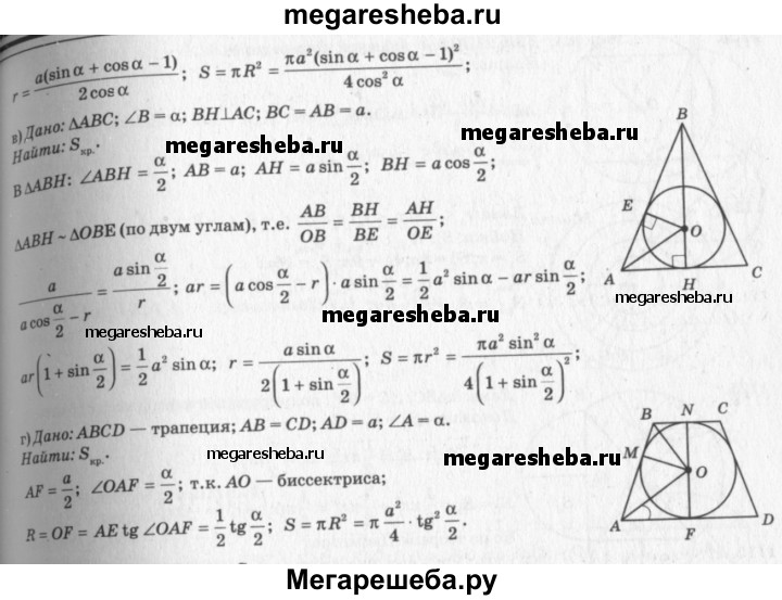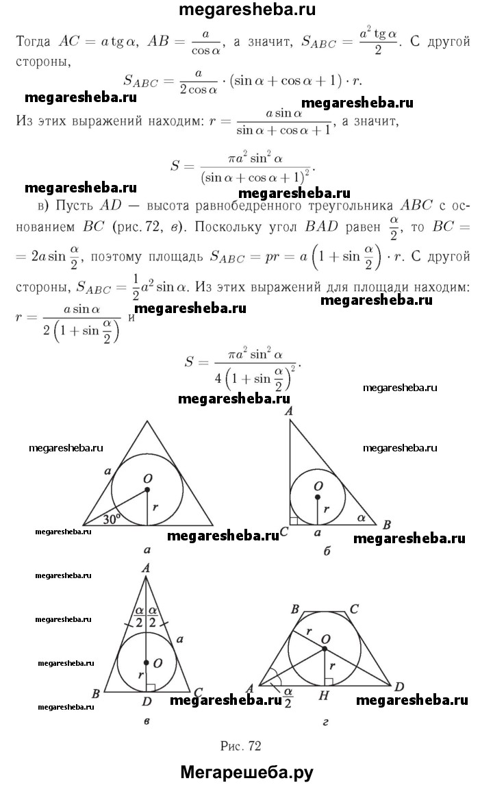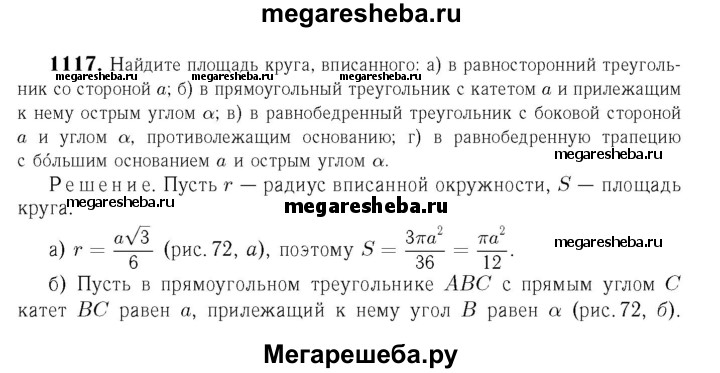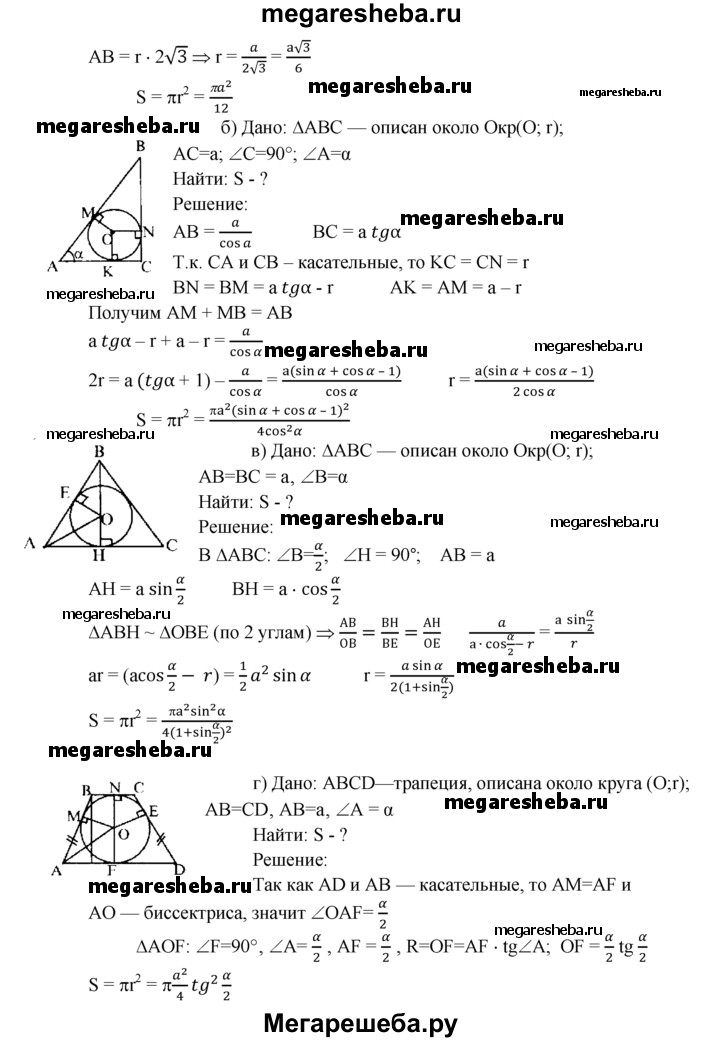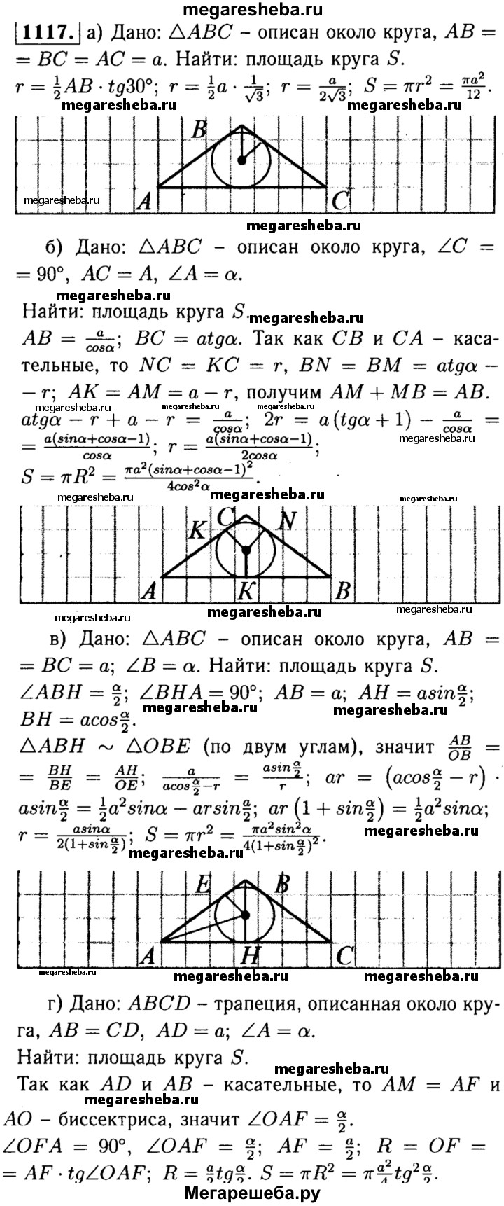 1117 Найдите площадь круга, вписанного: а) в равносторонний треугольник со стороной а; б) в прямоугольный треугольник с катетом а и прилежащим к нему острым углом а; в) в равнобедренный треугольник с боковой стороной а и углом а, противолежащим основанию; г) в равнобедренную трапецию с большим основанием а и острым углом а.