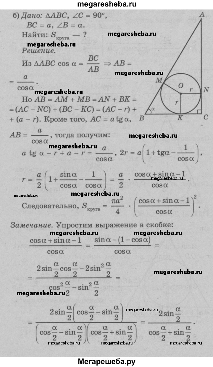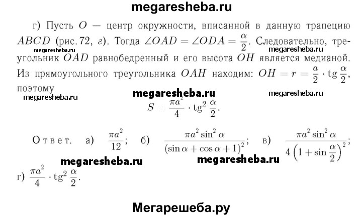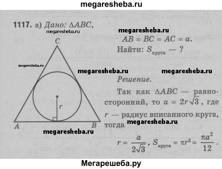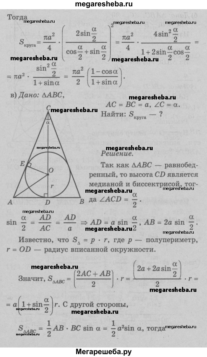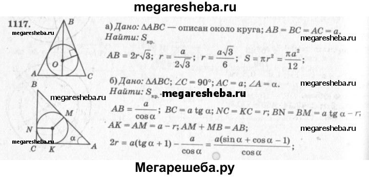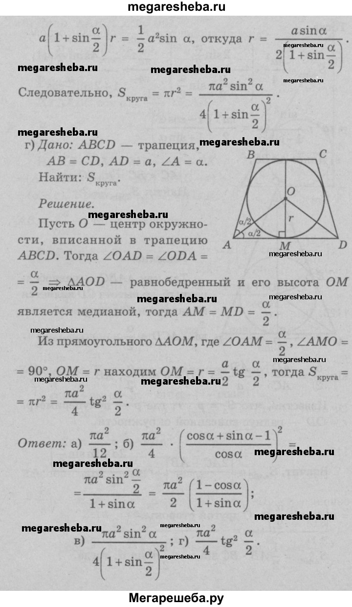 1117 Найдите площадь круга, вписанного: а) в равносторонний треугольник со стороной а; б) в прямоугольный треугольник с катетом а и прилежащим к нему острым углом а; в) в равнобедренный треугольник с боковой стороной а и углом а, противолежащим основанию; г) в равнобедренную трапецию с большим основанием а и острым углом а.