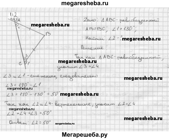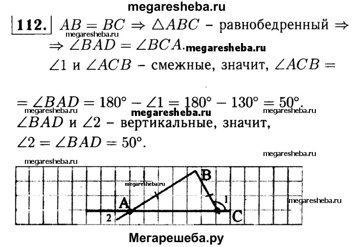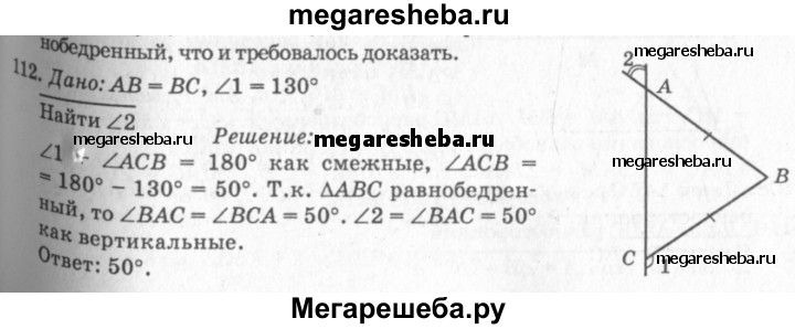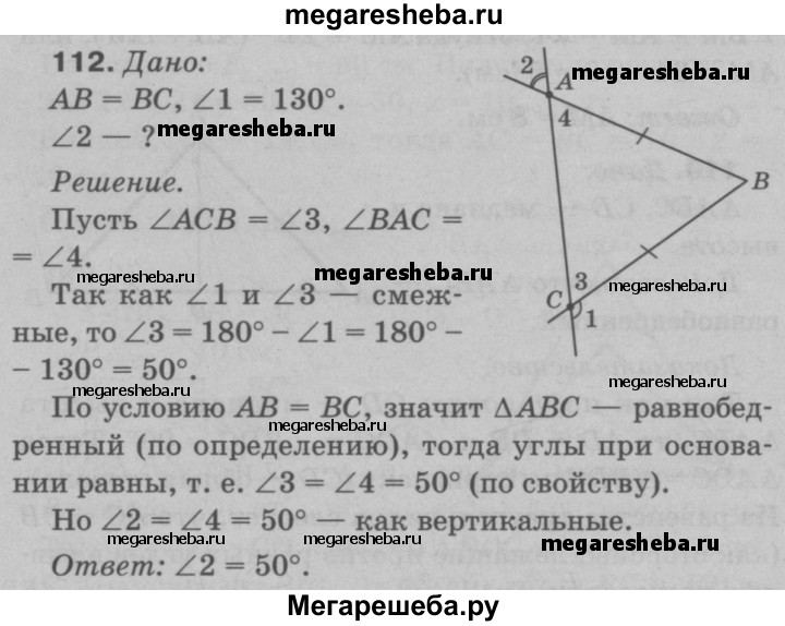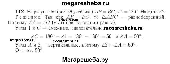 112 На рисунке 66 АВ = ВС, ∠1 = 130°. Найдите ∠2.
