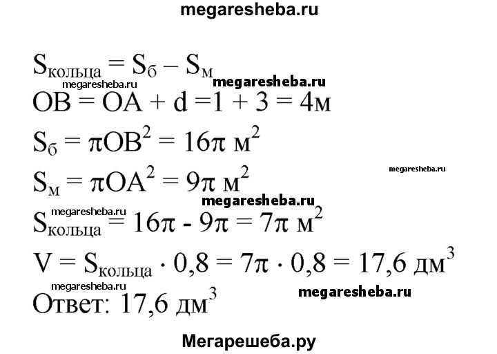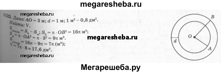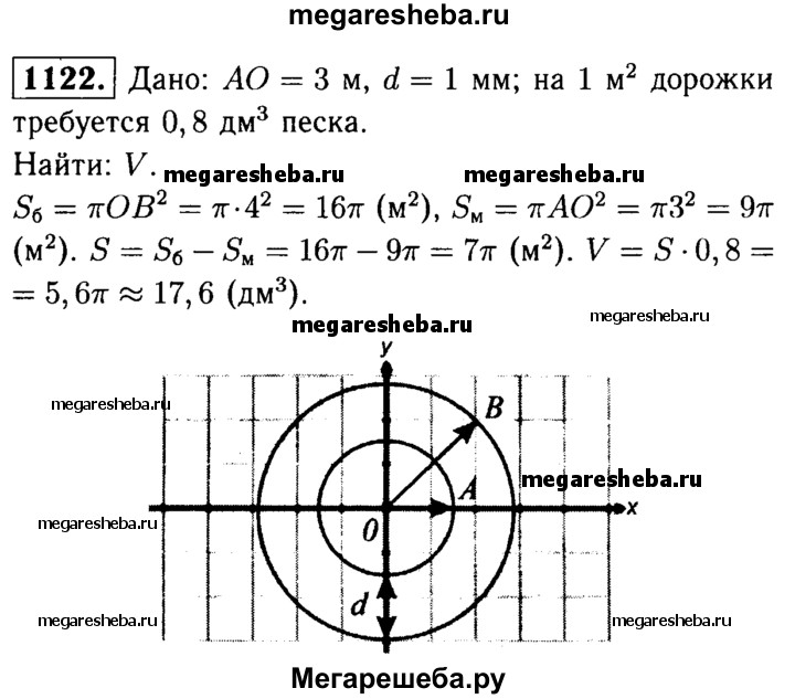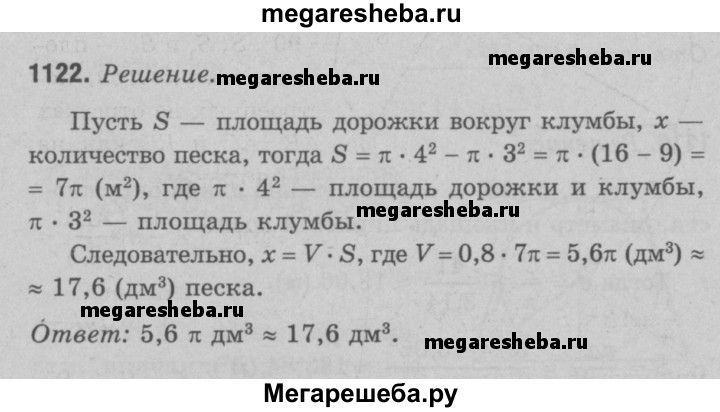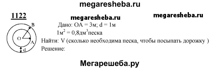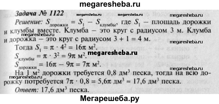 1122 Вокруг круглой клумбы, радиус которой равен 3 м, проложена дорожка шириной 1 м. Сколько нужно песка, чтобы посыпать дорожку, если на 1 м2 дорожки требуется 0,8 дм3 песка?