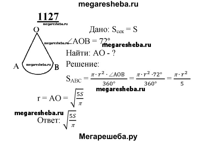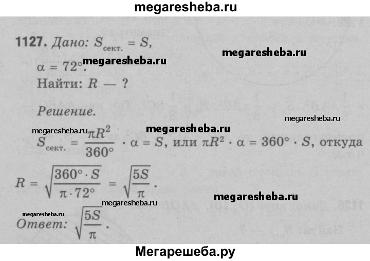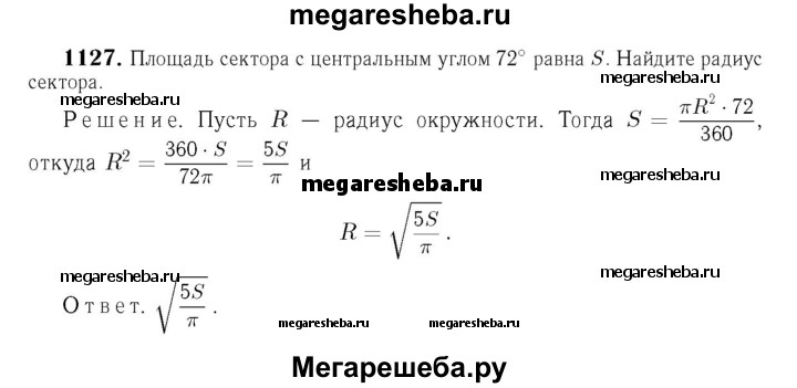 1127 Площадь сектора с центральным углом 72° равна S. Найдите радиус сектора.