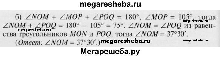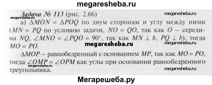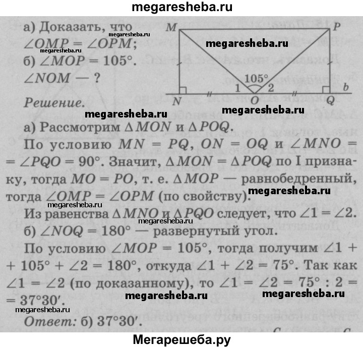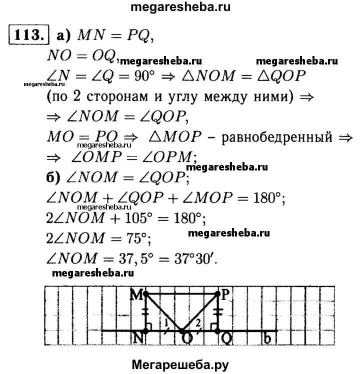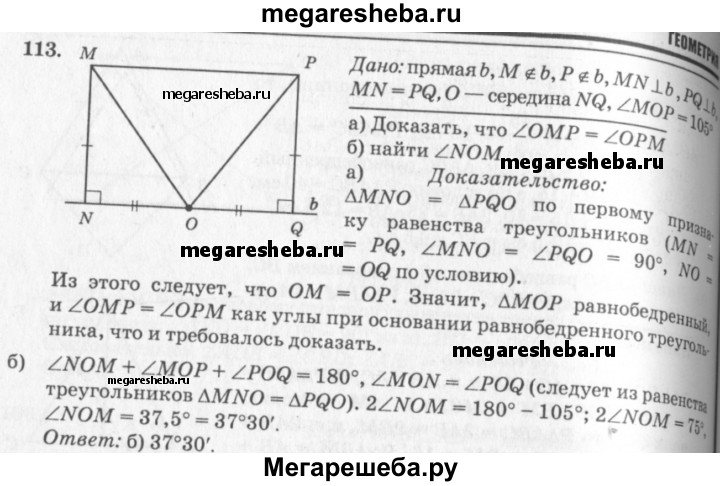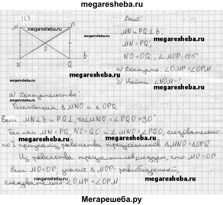 113 Точки М и Р лежат по одну сторону от прямой b. Перпендикуляры MN и PQ, проведённые к прямой b, равны. Точка О — середина отрезка NQ. а) Докажите, что ∠OMP = ∠OPM; б) найдите ∠NOM, если ∠MOP = 105°.