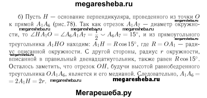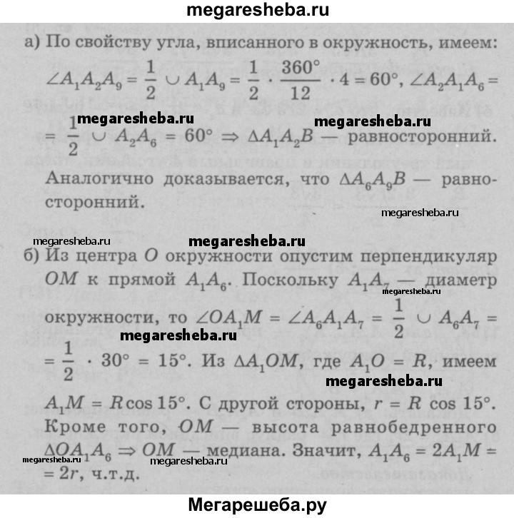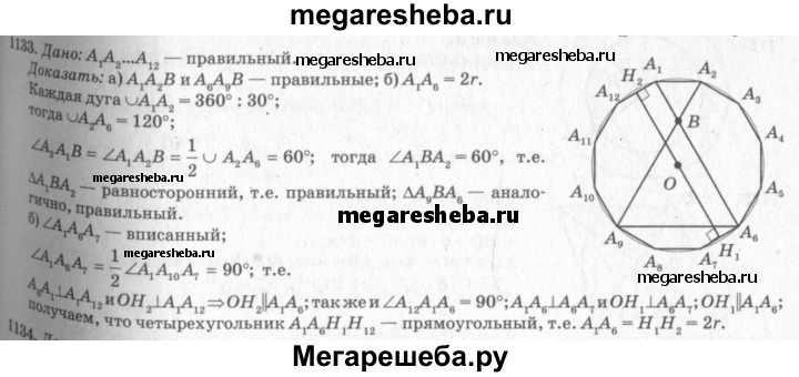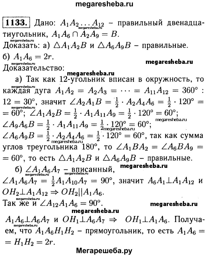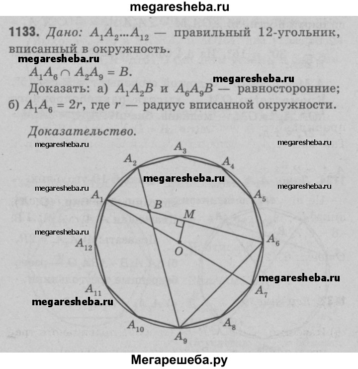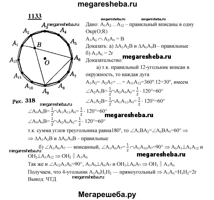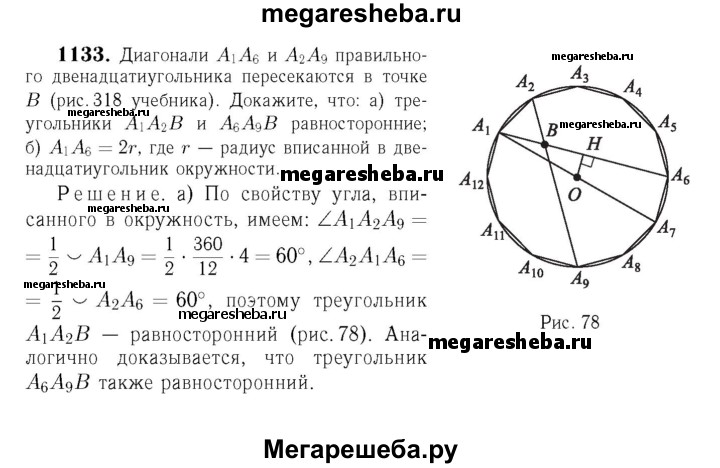 1133 Диагонали А1,А6 и А2А9 правильного двенадцатиугольника пересекаются в точке В (рис. 318). Докажите, что: а) треугольники А1А2B и А6А9В равносторонние; б) А1А6 = 2r, где r — радиус вписанной в двенадцатиугольник окружности.
