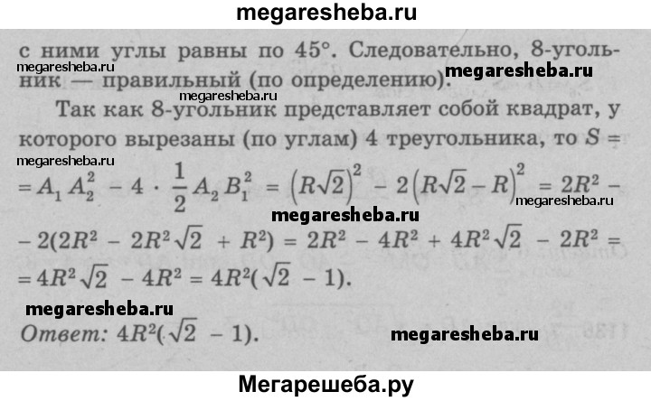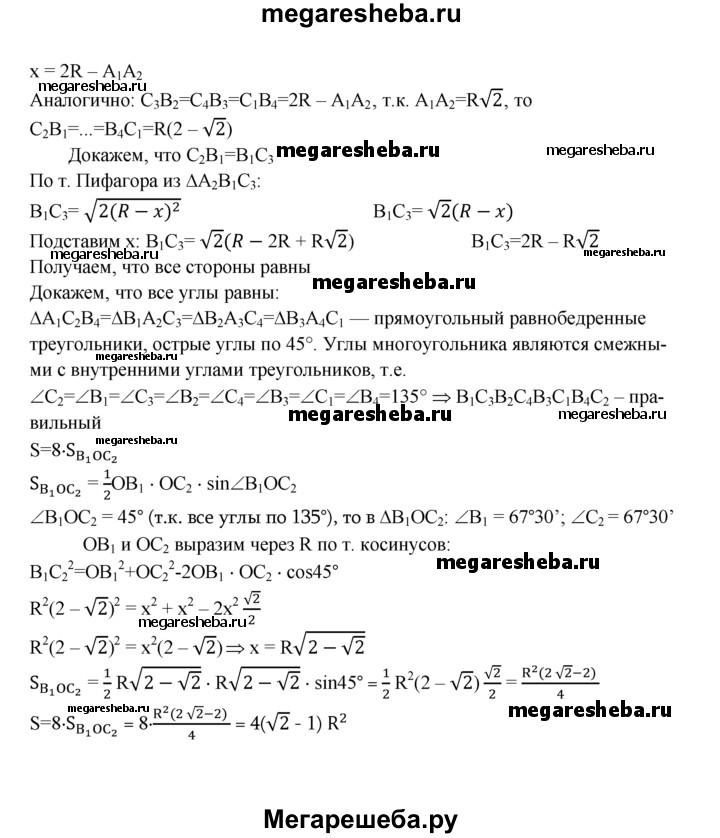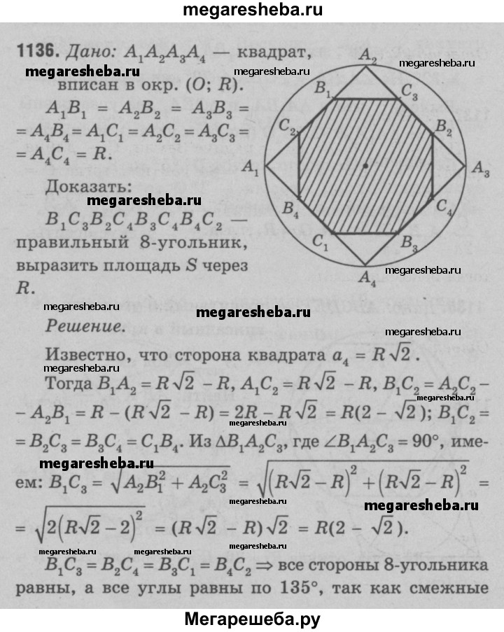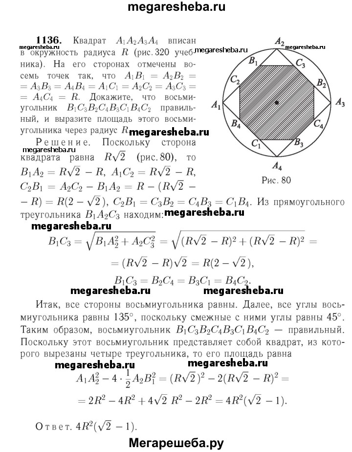 1136 Квадрат А1А2А3А4 вписан в окружность радиуса R (рис. 320). На его сторонах отмечены восемь точек так, что A1B1 = А2В2 = А3В3 = А4В4 = А1С1 = А2С2 = А3С3 = А4С4 = R. Докажите, что восьмиугольник В1С3В2С4В3С1В4С2 правильный, и выразите площадь этого восьмиугольника через радиус R.
