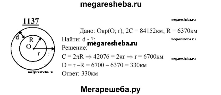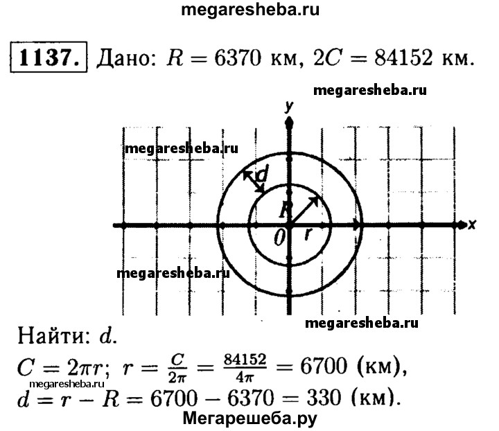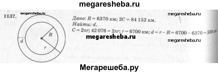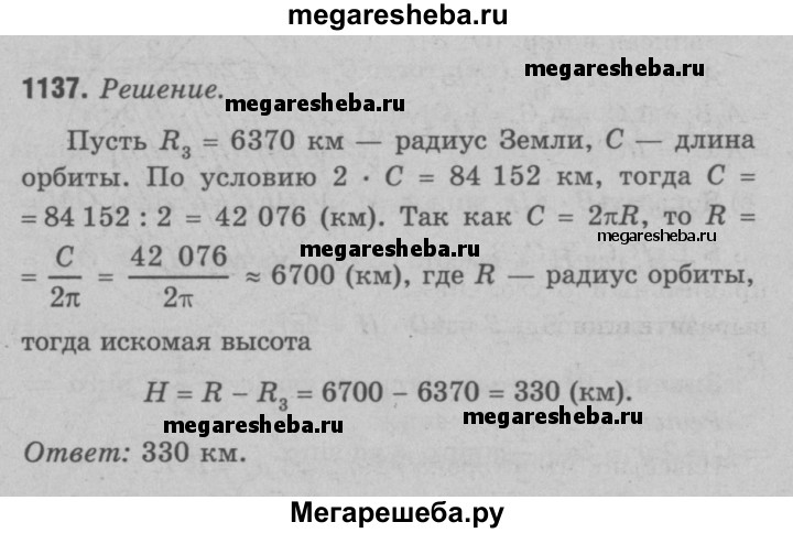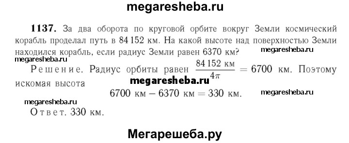 1137 За два оборота по круговой орбите вокруг Земли космический корабль проделал путь 84 152 км. На какой высоте над поверхностью Земли находится корабль, если радиус Земли равен 6370 км?