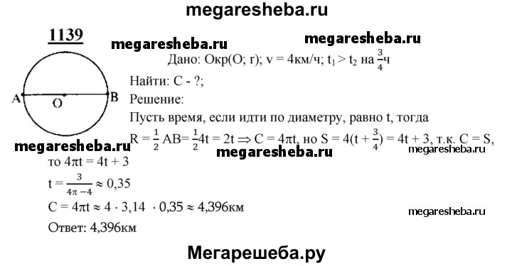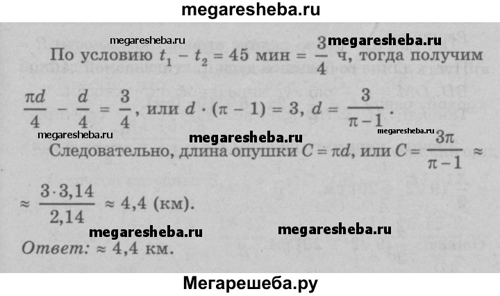 1139 Лесной участок имеет форму круга. Чтобы обойти этот участок по опушке, идя со скоростью 4 км/ч, нужно затратить на 45 мин больше, чем для того, чтобы пересечь его по диаметру. Найдите длину опушки данного участка.