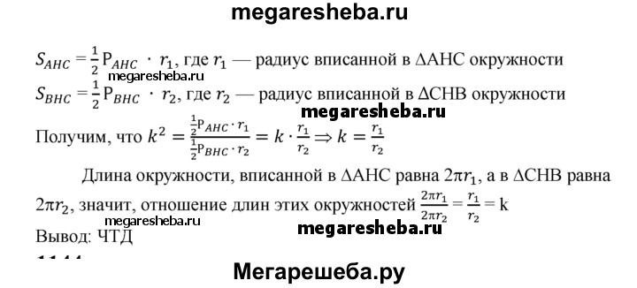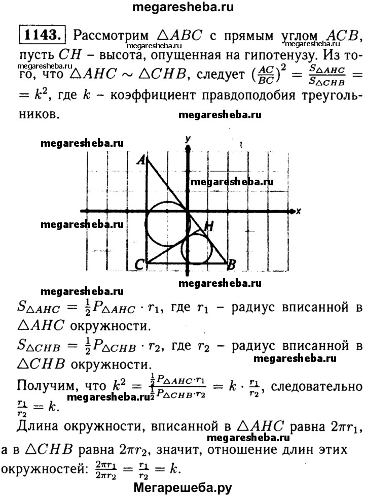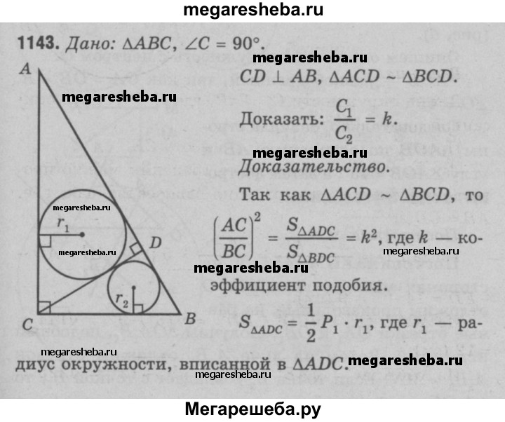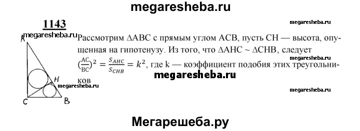 1143 Высота прямоугольного треугольника, проведённая к гипотенузе, разделяет треугольник на два подобных треугольника (см. задачу 2, п. 65). Докажите, что отношение длин окружностей, вписанных в эти треугольники, равно коэффициенту подобия этих треугольников.