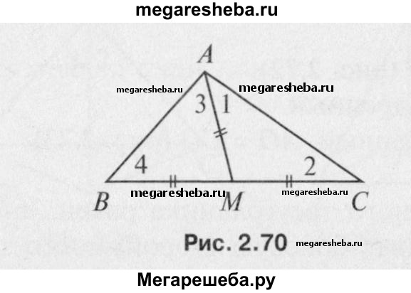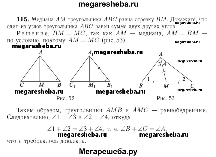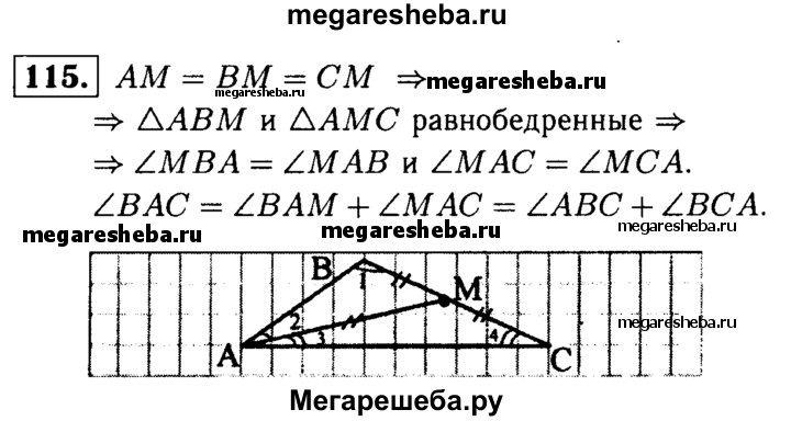 115 Медиана AM треугольника ABC равна отрезку ВМ. Докажите, что один из углов треугольника ABC равен сумме двух других углов.
