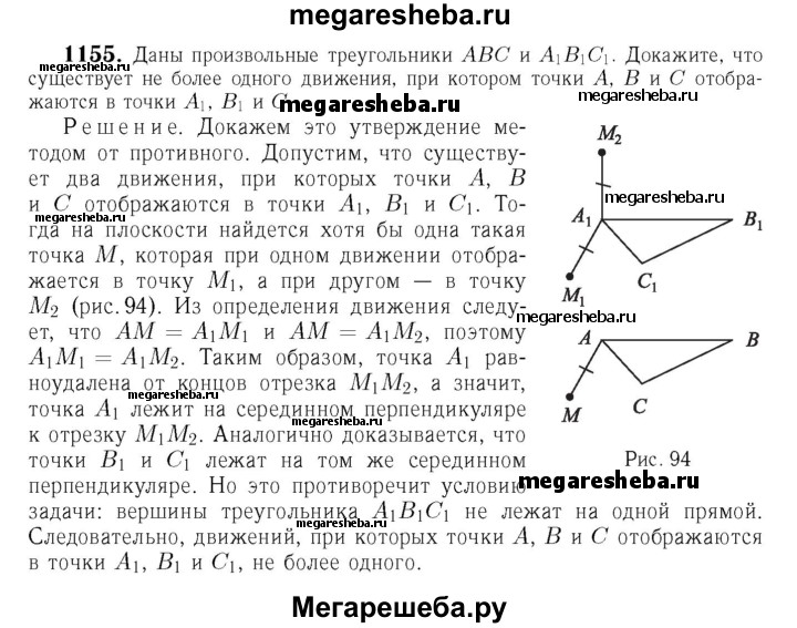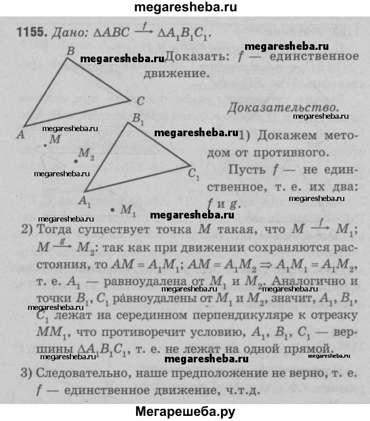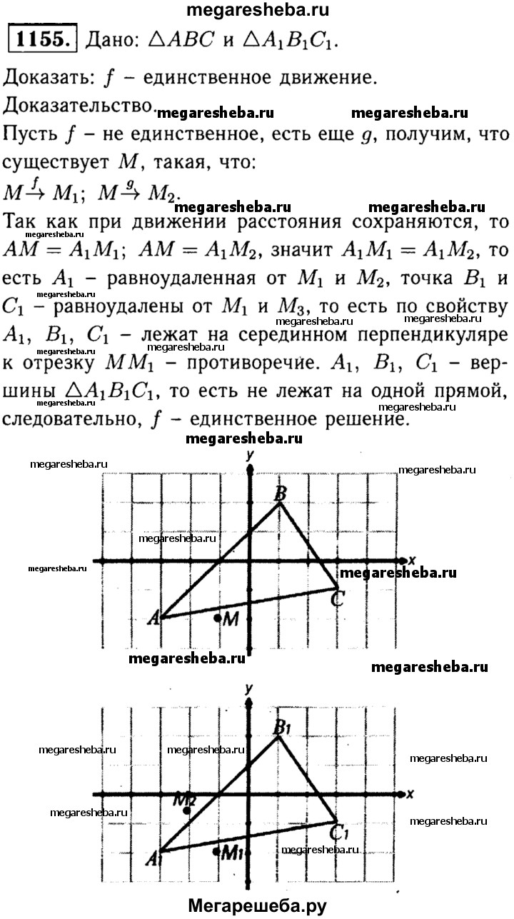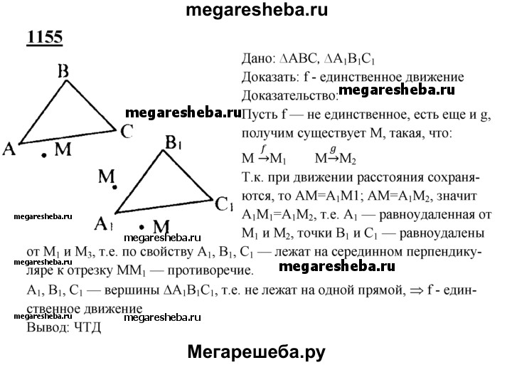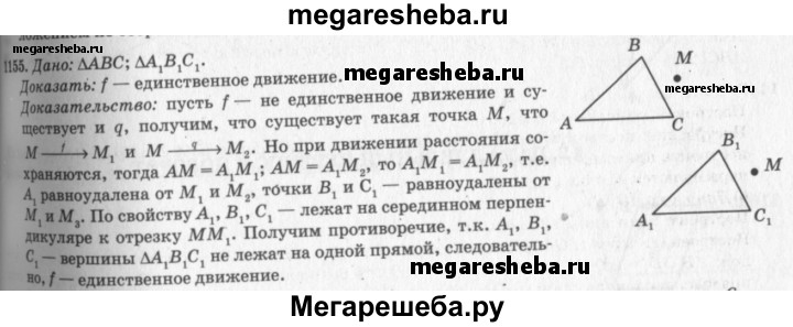 1155 ABC и A1B1C1 — произвольные треугольники. Докажите, что существует не более одного движения, при котором точки А, В и С отображаются в точки А1, В1, С1.