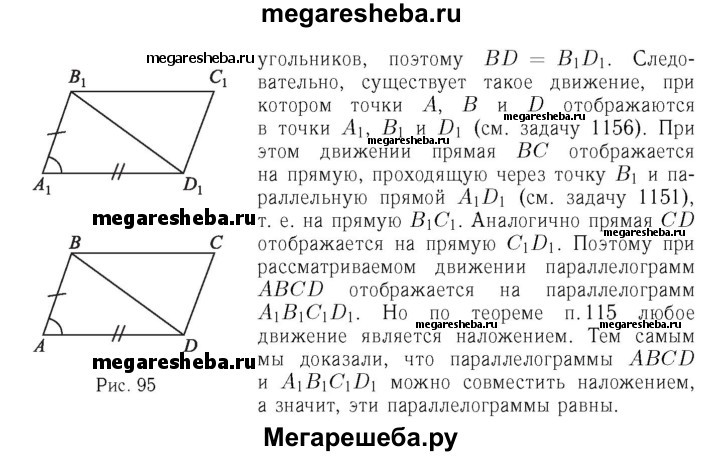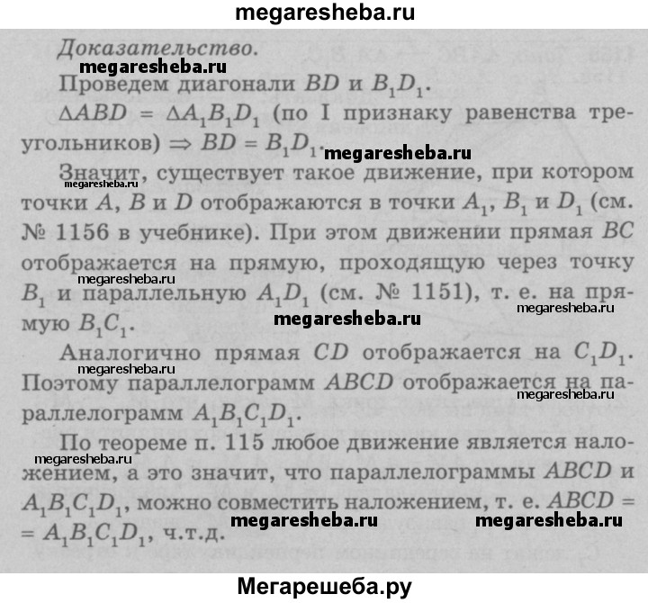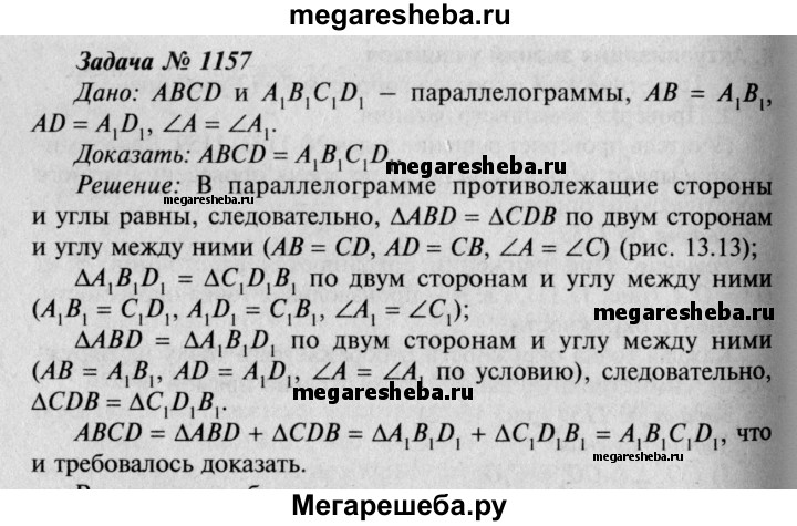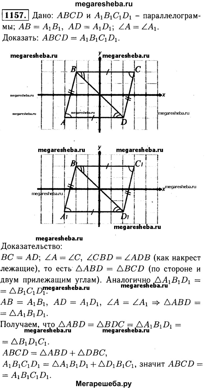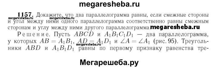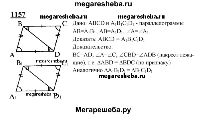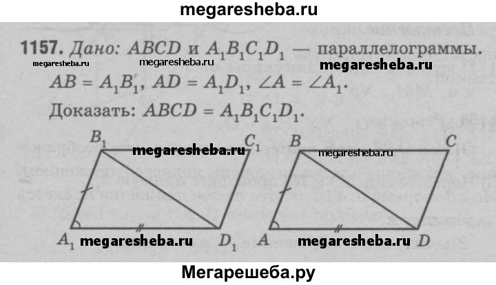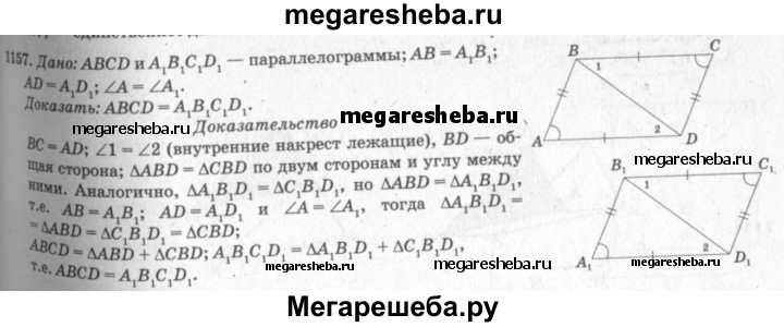 1157 Докажите, что два параллелограмма равны, если смежные стороны и угол между ними одного параллелограмма соответственно равны смежным сторонам и углу между ними другого параллелограмма.