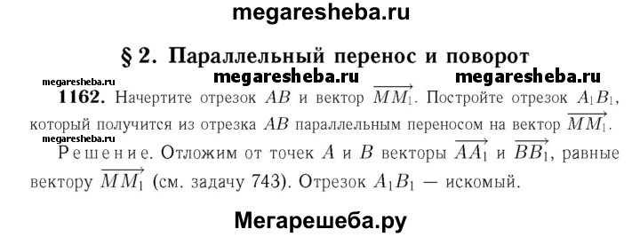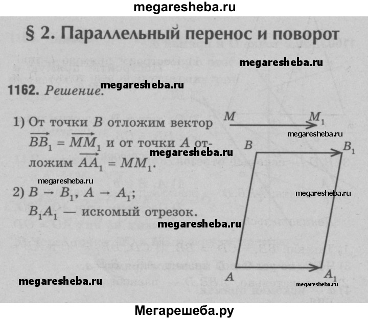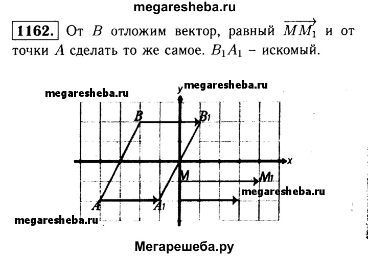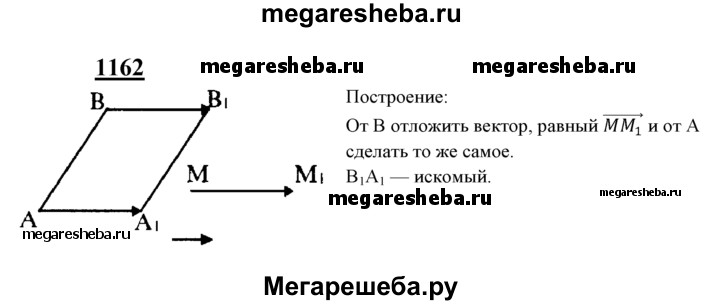 1162 Начертите отрезок АВ и вектор ММ1. Постройте отрезок А1В1, который получается из отрезка АВ параллельным переносом на вектор ММ1.