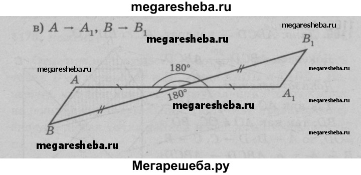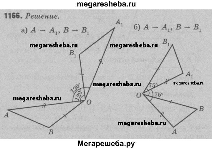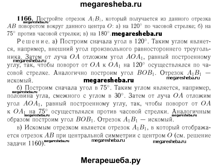 1166 Постройте отрезок А1В2, который получается из данного отрезка АВ поворотом вокруг данного центра О: а) на 120° по часовой стрелке; б) на 75° против часовой стрелки; в) на 180°.