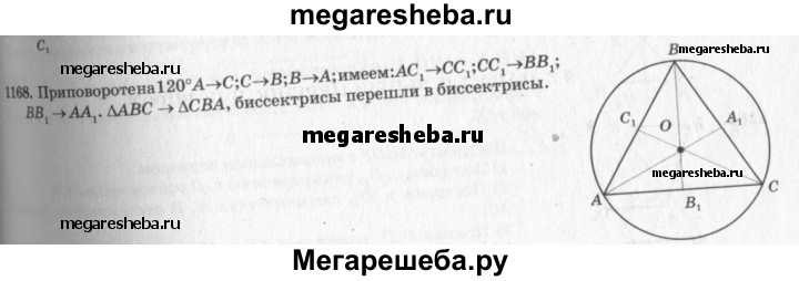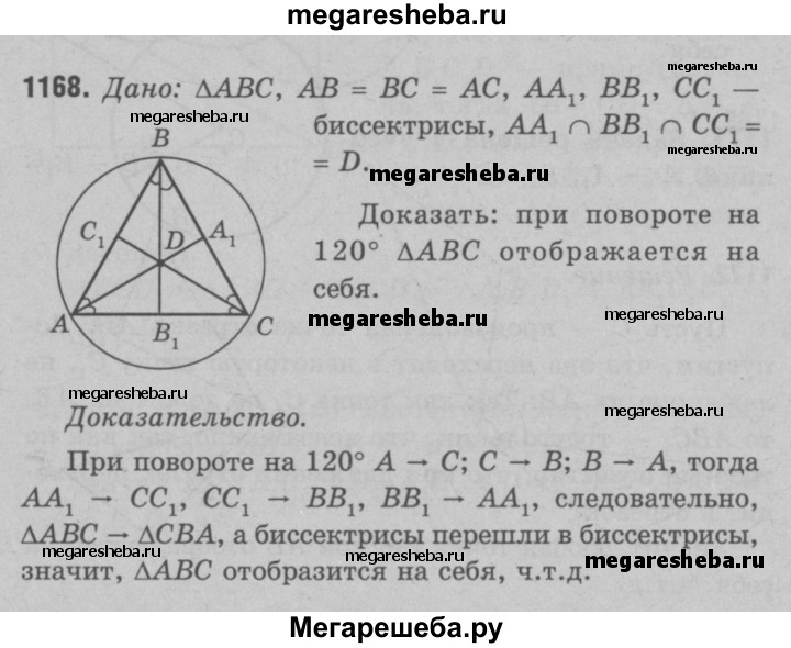 1168 Точка D является точкой пересечения биссектрис равностороннего треугольника ABC. Докажите, что при повороте вокруг точки D на угол 120° треугольник ABC отображается на себя.