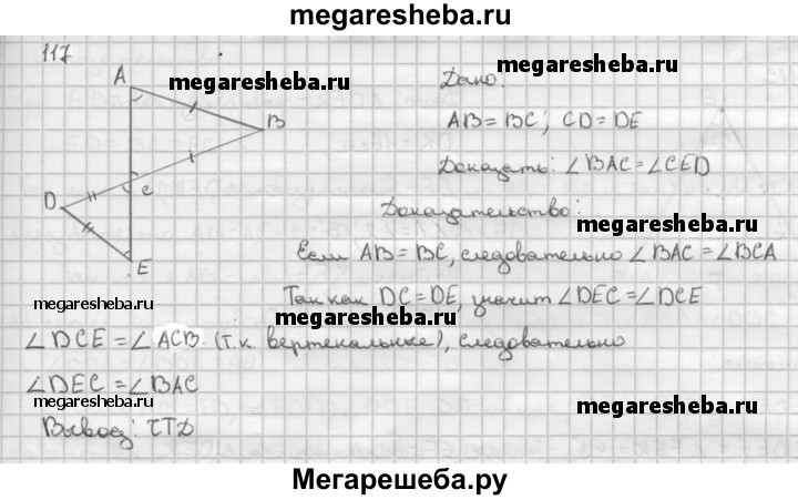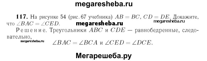 117 На рисунке 67 АВ = ВС, CD = DE. Докажите, что ∠BAC = ∠CED.