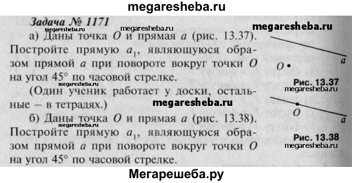 1171 Постройте прямую а1, которая получается из данной прямой а поворотом вокруг точки О на угол 60° по часовой стрелке, если прямая а: а) не проходит через точку О; б) проходит через точку О.