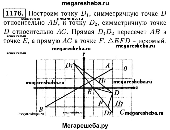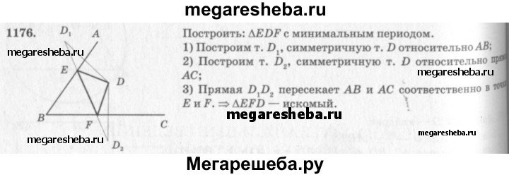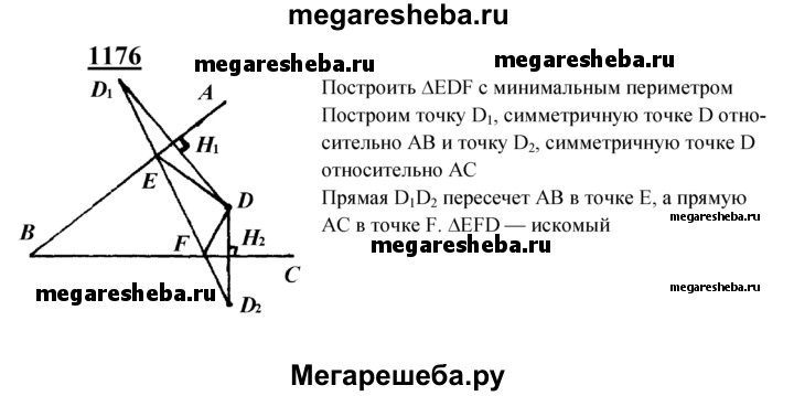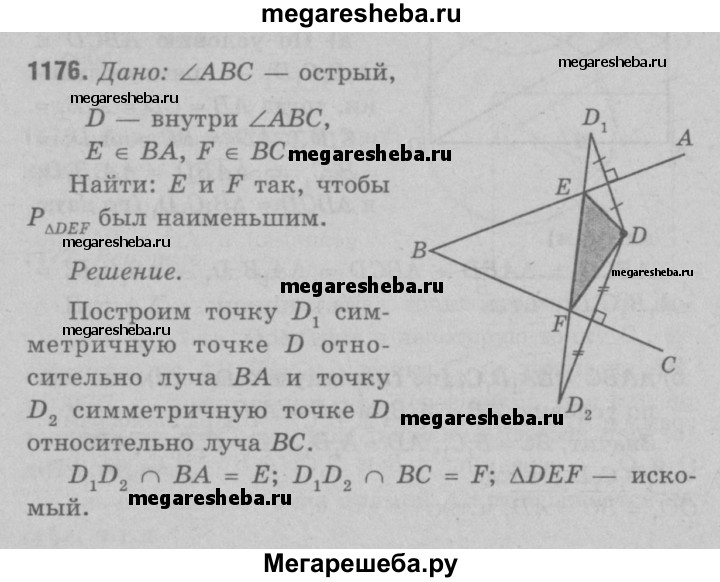 1176 Даны острый угол АBС и точка D внутри него. Используя осевую симметрию, найдите на сторонах данного угла такие точки Е и F, чтобы треугольник DEF имел наименьший периметр.