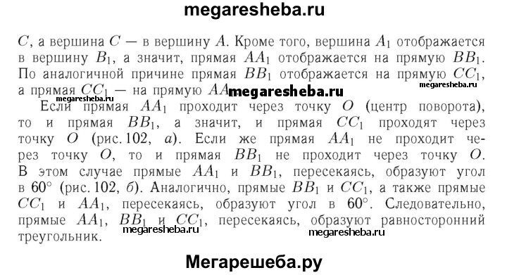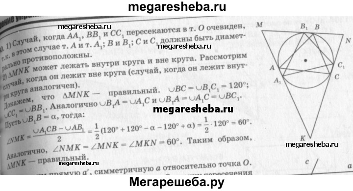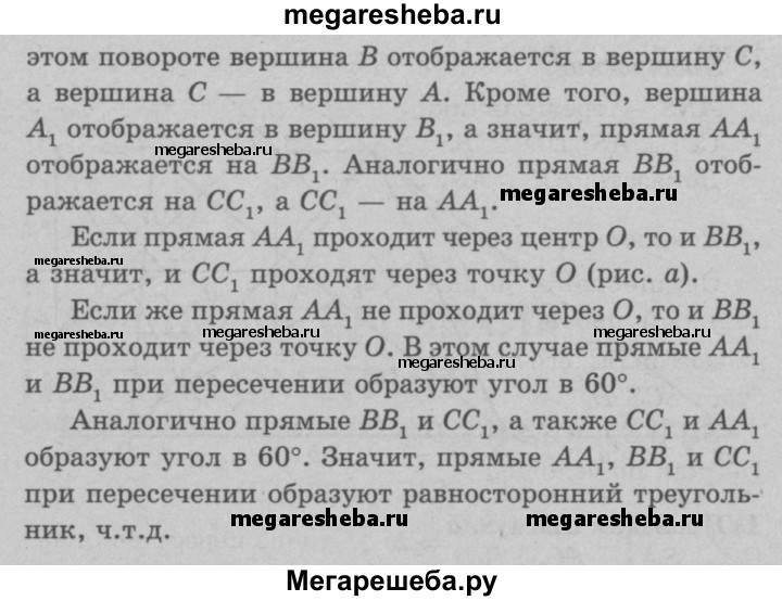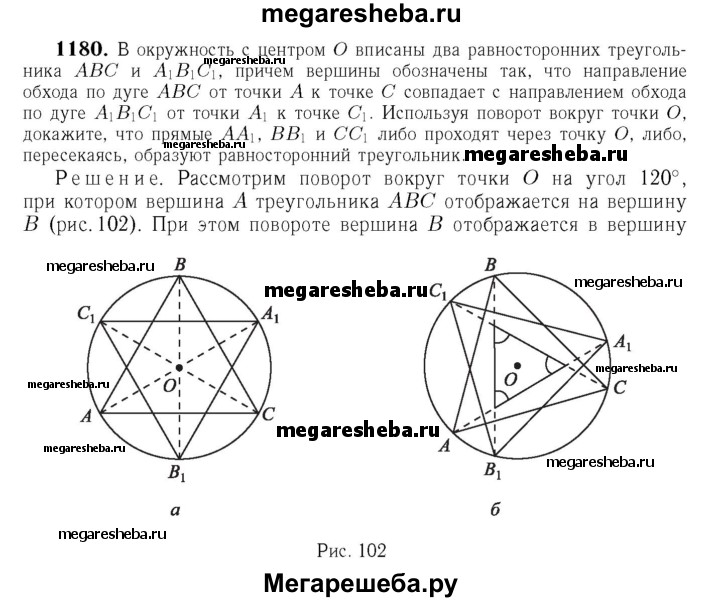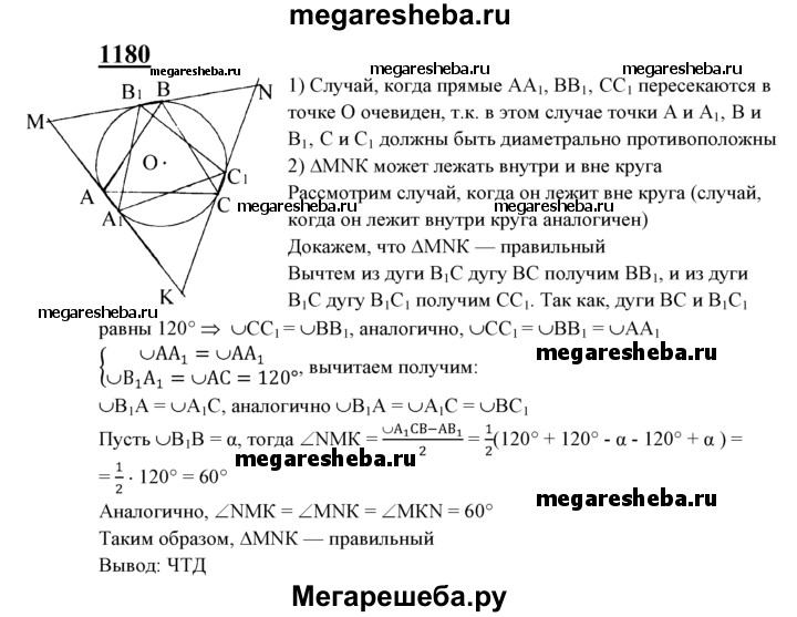 1180 В окружность с центром О вписаны два равносторонних треугольника АBС и А1B1С1, причём вершины обозначены так, что направление обхода по дуге АBС от точки А к точке С совпадает с направлением обхода по дуге А1В1С1 от точки Ах к точке С1. Используя поворот вокруг точки О, докажите, что прямые АА1, ВВ1 и СС1 либо проходят через точку О, либо, пересекаясь, образуют равносторонний треугольник.