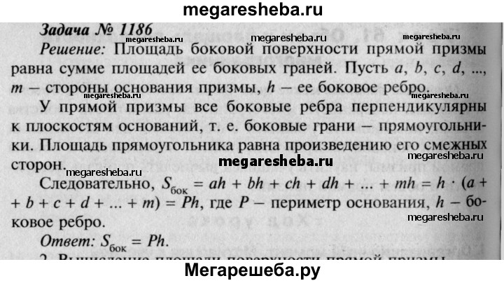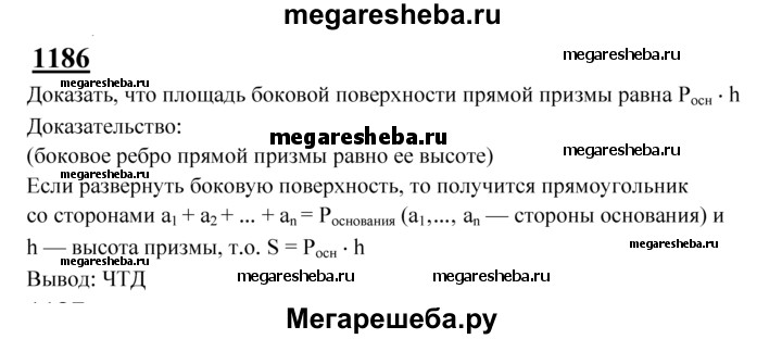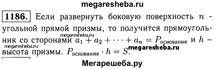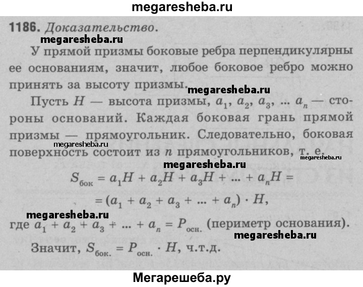 1186 Докажите, что площадь боковой поверхности прямой призмы (т. е. сумма площадей её боковых граней) равна произведению периметра основания на боковое ребро.