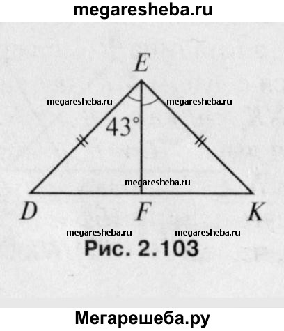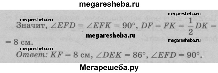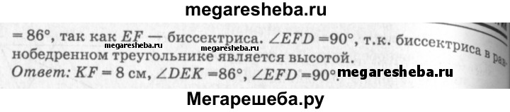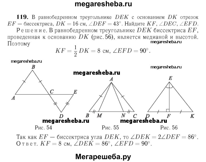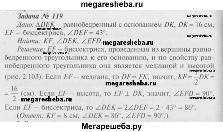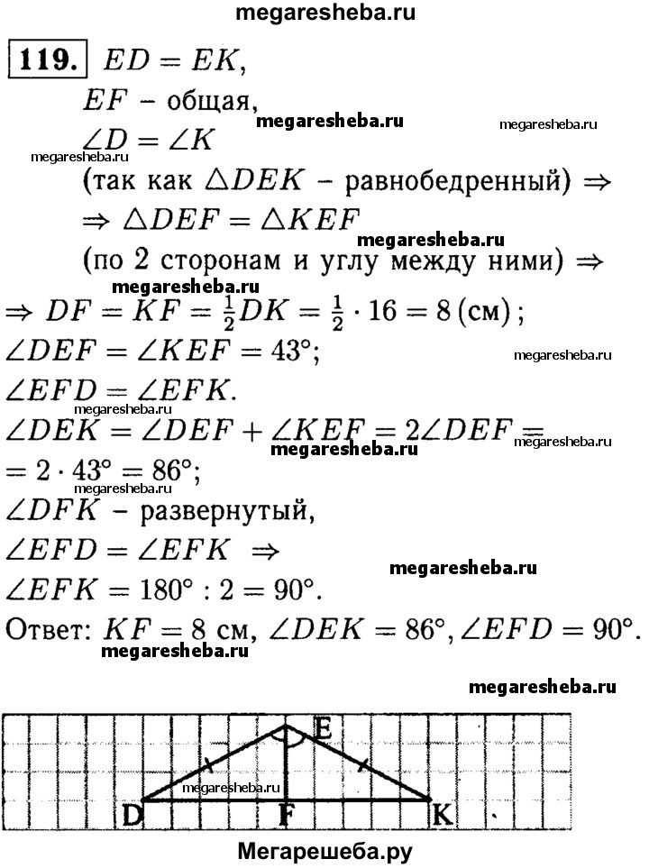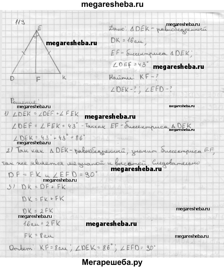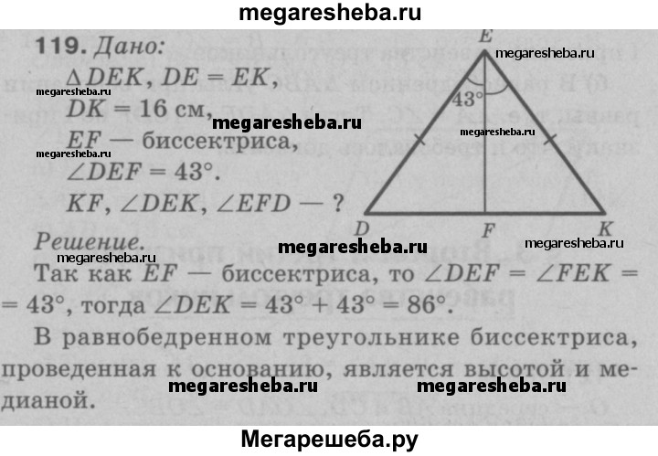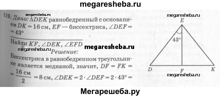 119 В равнобедренном треугольнике DEK с основанием DK = 16 см отрезок EF — биссектриса, ∠DEF = 43°. Найдите KF, ∠DEK, ∠EFD.