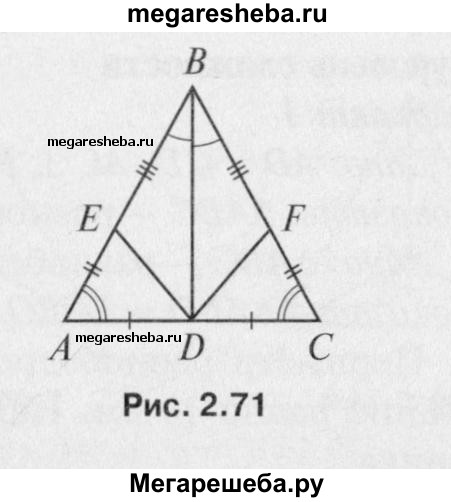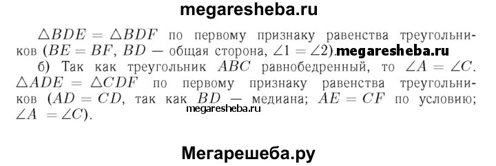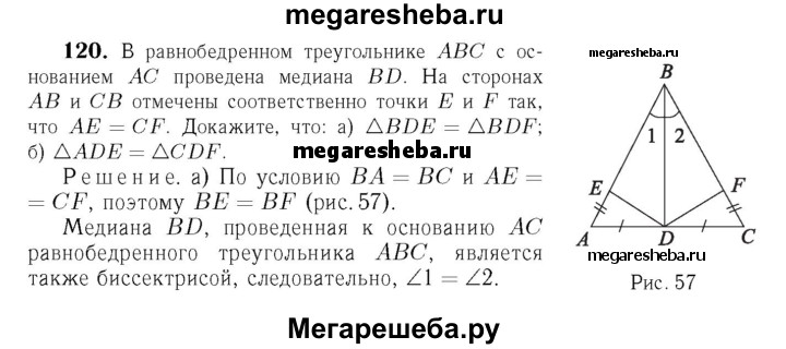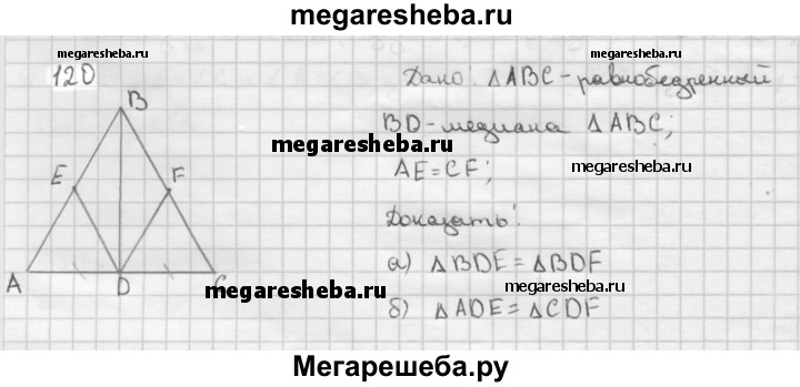 120 В равнобедренном треугольнике ABC с основанием АС проведена медиана BD. На сторонах АВ и СВ отмечены соответственно точки Е и F так, что AE = CF. Докажите, что: a) ΔBDE = ΔBDF; б) ΔADE = ΔCDF.