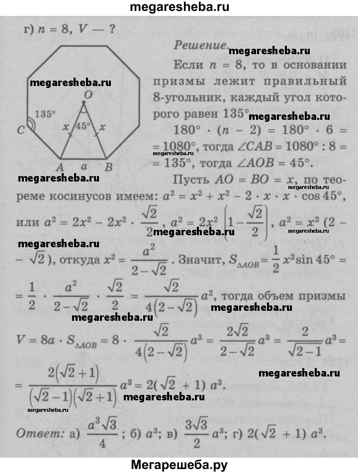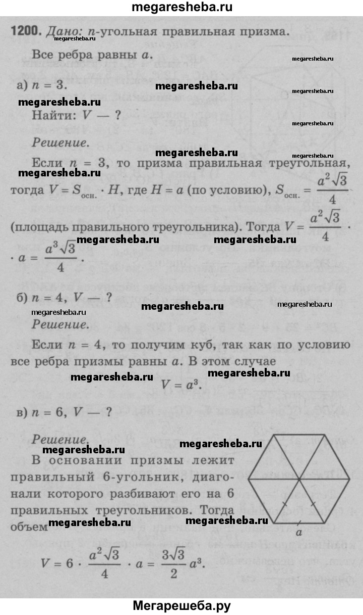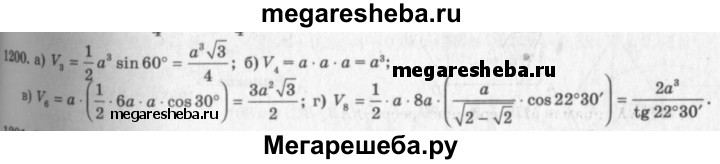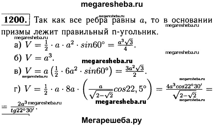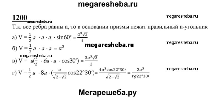 1200 Найдите объём правильной n-угольной призмы, все рёбра которой равны а, если: а) n = 3; б) n = 4; в) n = 6; г) n = 8.