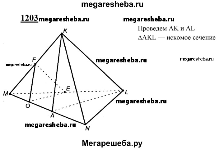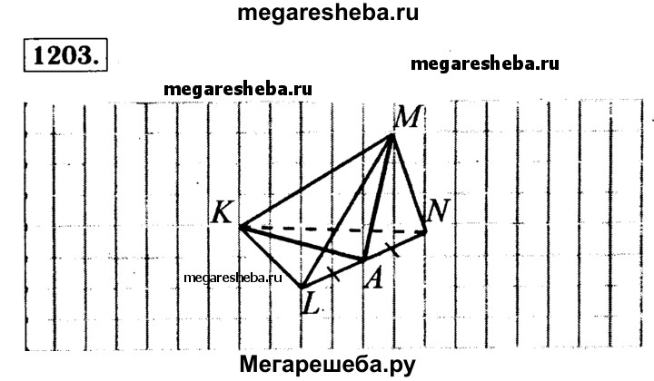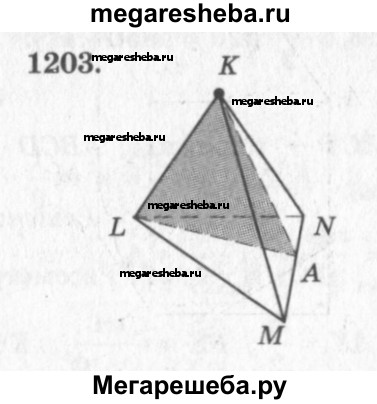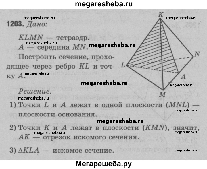 1203 Изобразите тетраэдр KLMN и постройте сечение этого тетраэдра плоскостью, проходящей через ребро KL и середину А ребра MN.