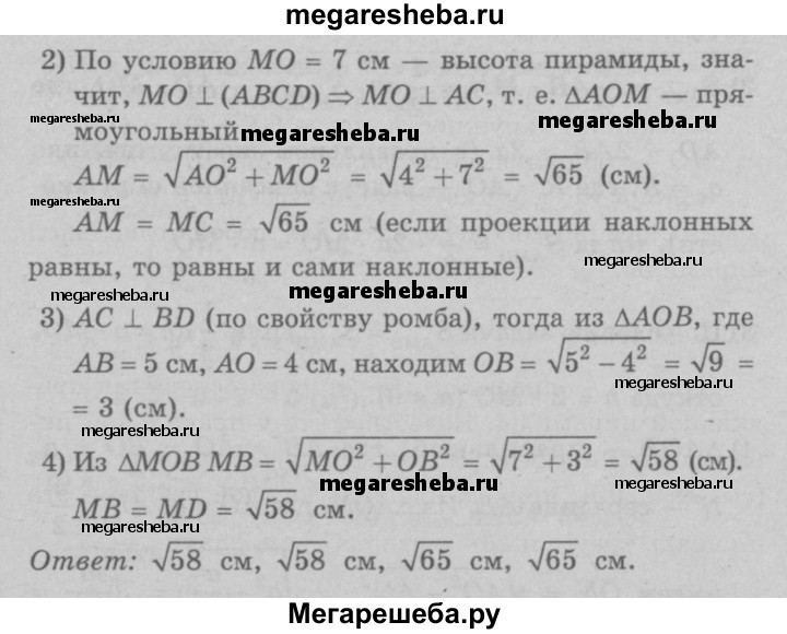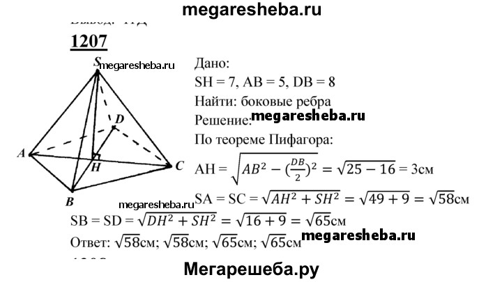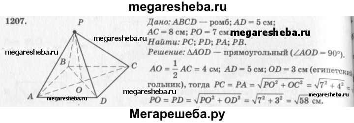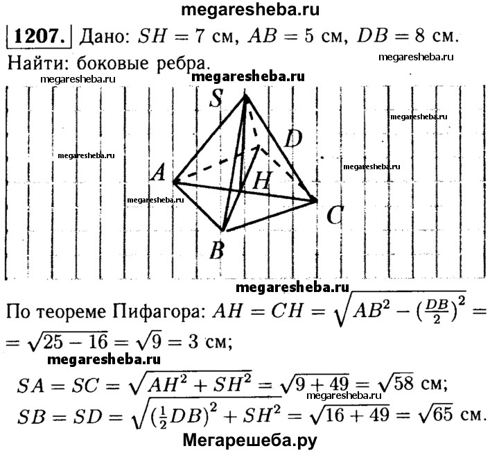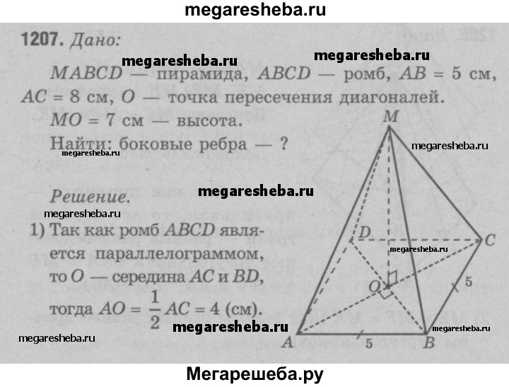 1207 Основанием пирамиды является ромб, сторона которого равна 5 см, а одна из диагоналей равна 8 см. Найдите боковые рёбра пирамиды, если её высота проходит через точку пересечения диагоналей основания и равна 7 см.
