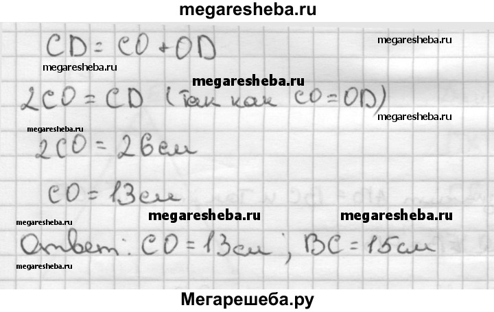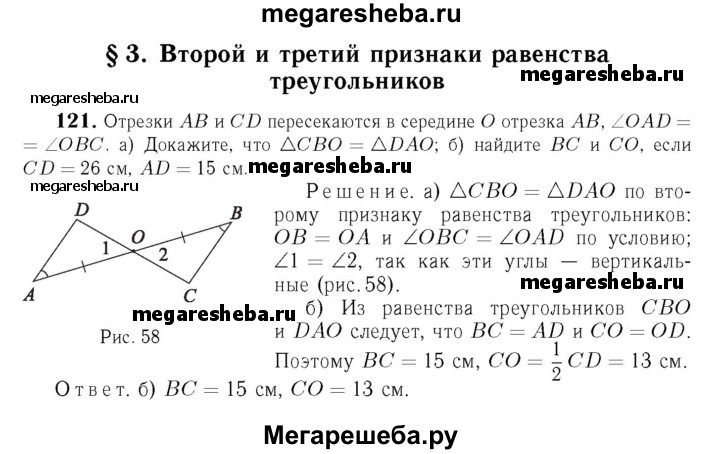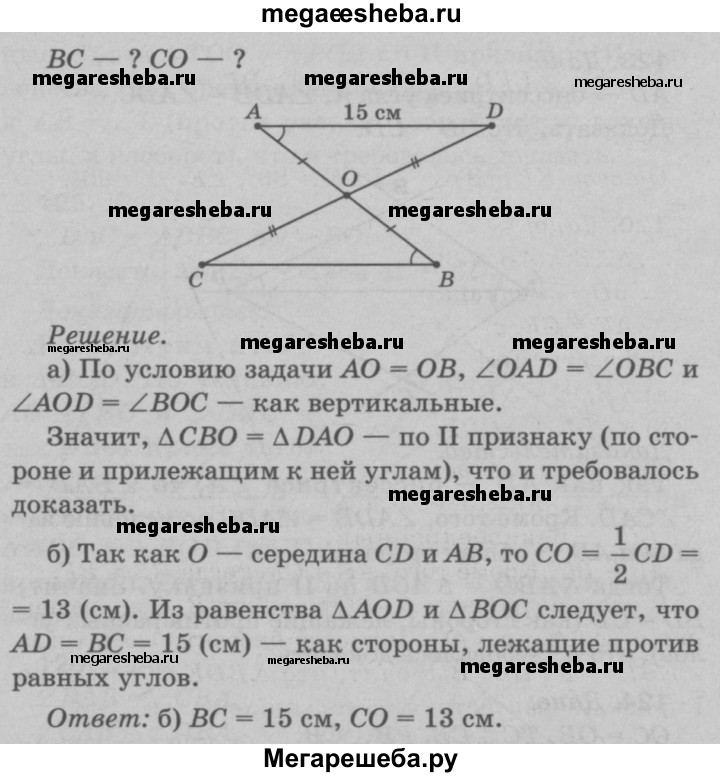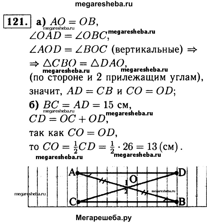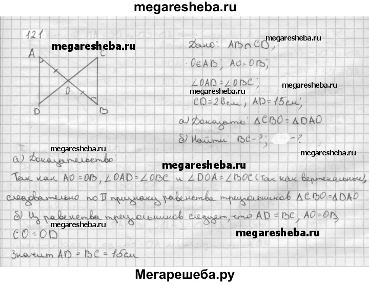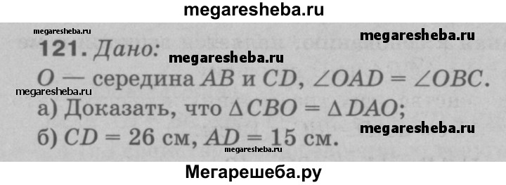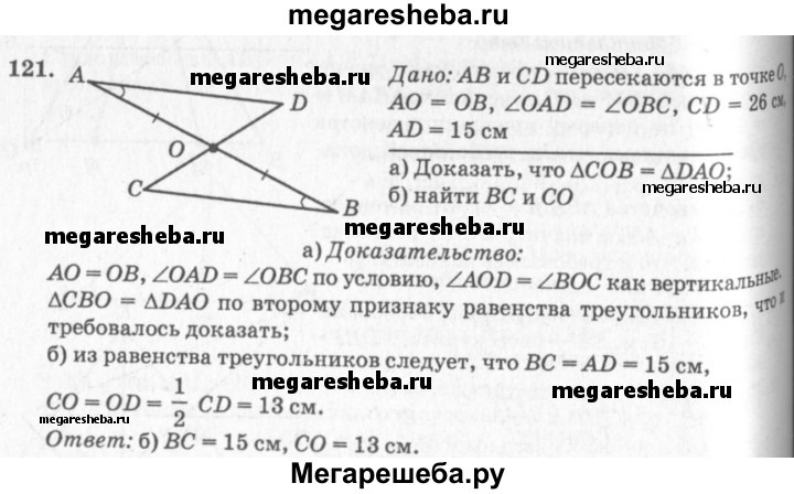 121 Отрезки АВ и CD пересекаются в середине О отрезка АВ, ∠OAD = ∠OBC. а) Докажите, что ΔСВО = ΔDAO; б) найдите ВС и СО, если CD - 26 см, AD = 15 см.