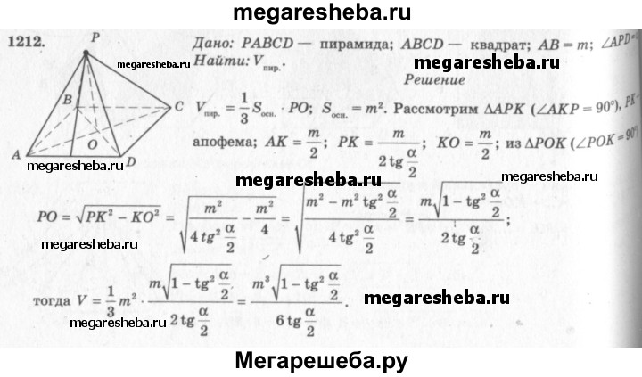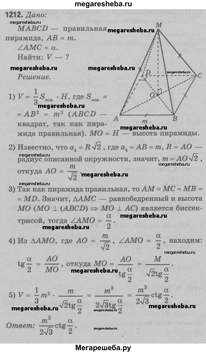 1212 Найдите объём правильной четырёхугольной пирамиды, если сторона её основания равна т, а плоский угол (т. е. угол грани) при вершине равен а.
