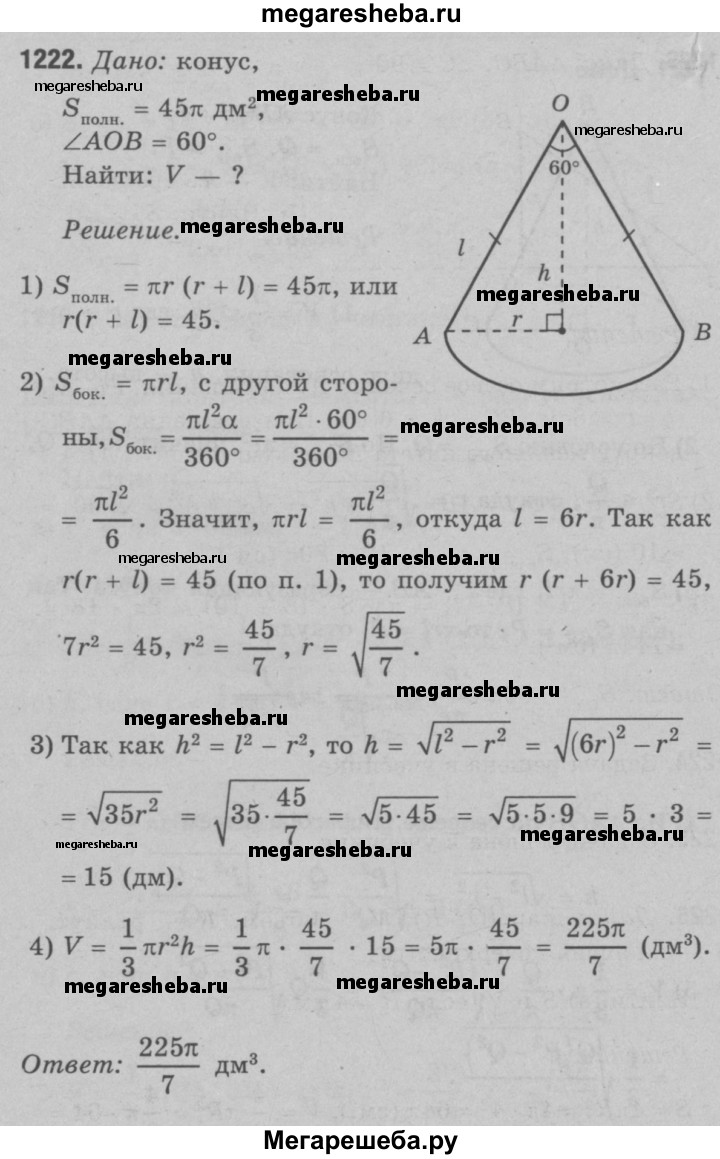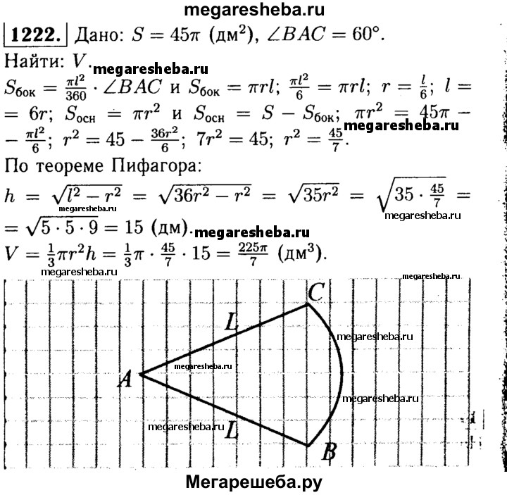 1222 Площадь полной поверхности конуса равна 45л дм2. Развёртка боковой поверхности конуса представляет собой круговой сектор с дугой в 60°. Найдите объём конуса.
