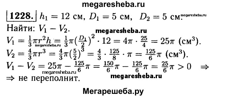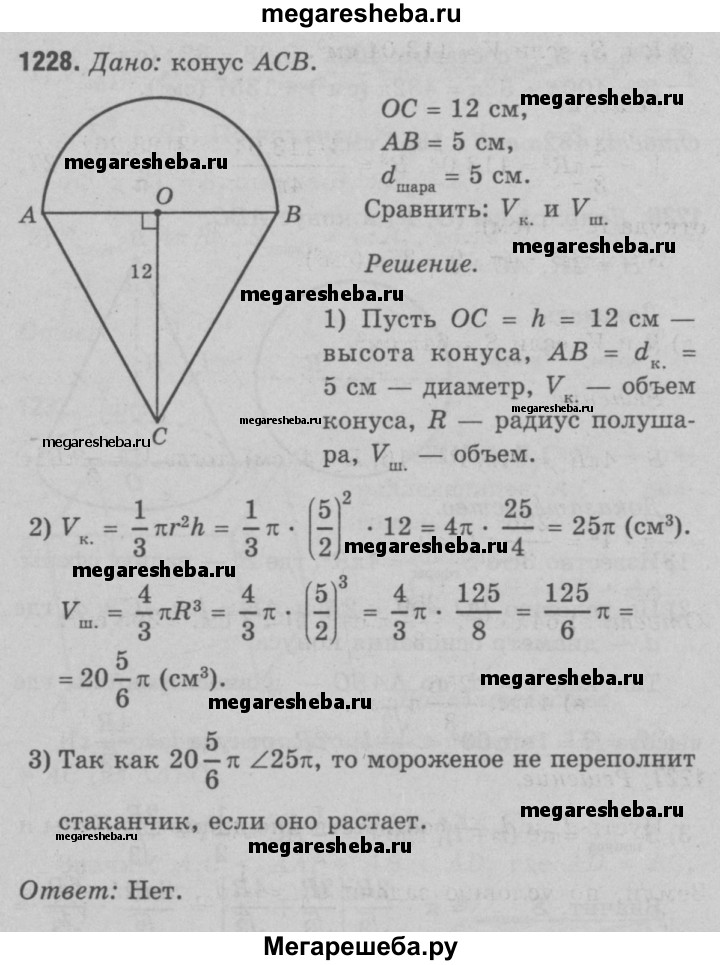 1228 Стаканчик для мороженого конической формы имеет глубину 12 см и диаметр верхней части 5 см. На него сверху положили две ложки мороженого в виде полушарий диаметром 5 см. Переполнит ли мороженое стаканчик, если оно растает?