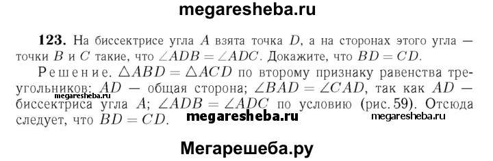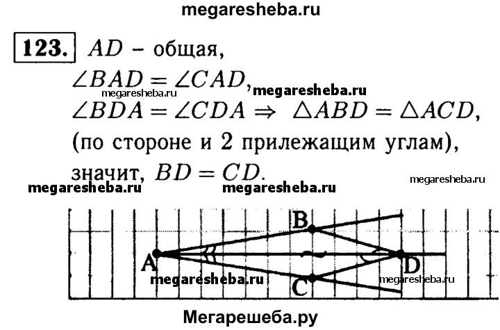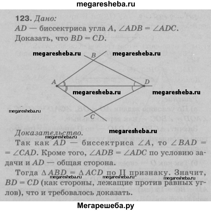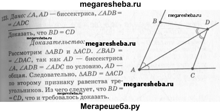 123 На биссектрисе угла А взята точка D, а на сторонах этого угла — точки В и С такие, что ZADB = ∠ADC. Докажите, что BD = CD.
