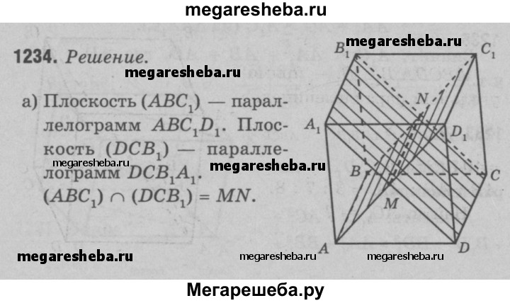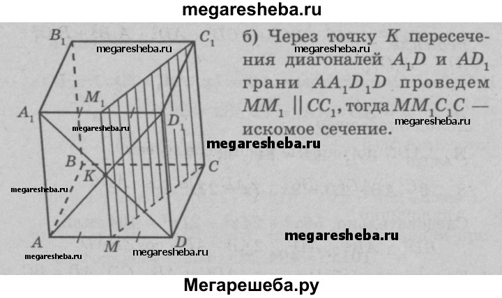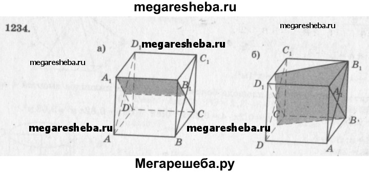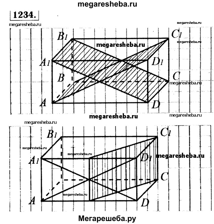 1234 Изобразите параллелепипед ABCDA1B1C1D1 и постройте: а) его сечения плоскостями АВС1 и DCB1, а также отрезок, по которому эти сечения пересекаются; б) его сечение плоскостью, проходящей через ребро СС1 и точку пересечения диагоналей грани AA1D1D