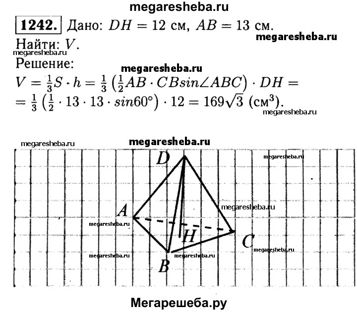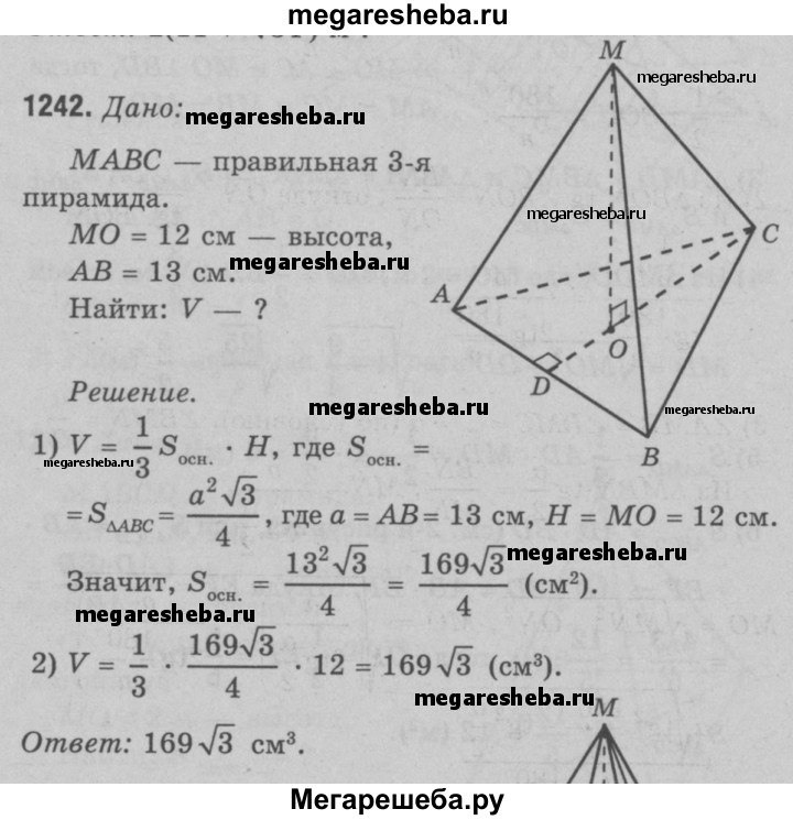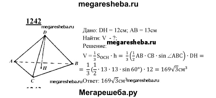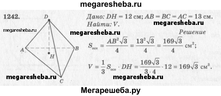 1242 Найдите объём правильной треугольной пирамиды, высота которой равна 12 см, а сторона основания равна 13 см.