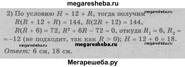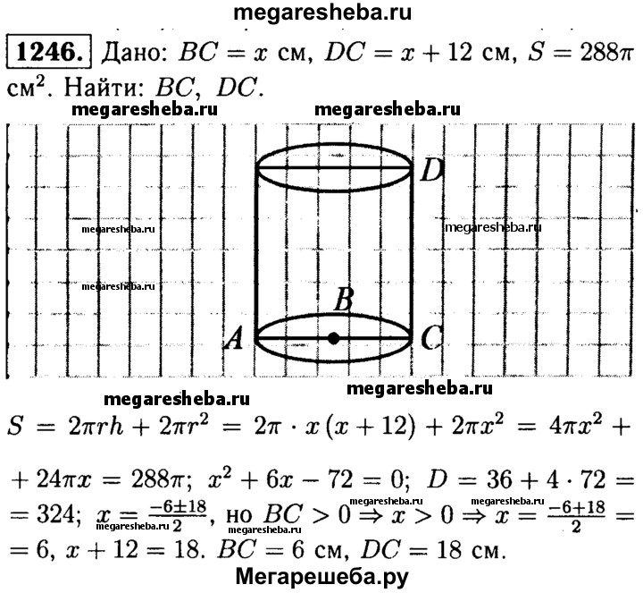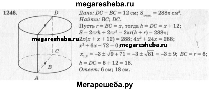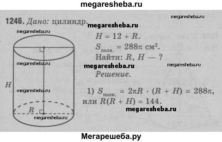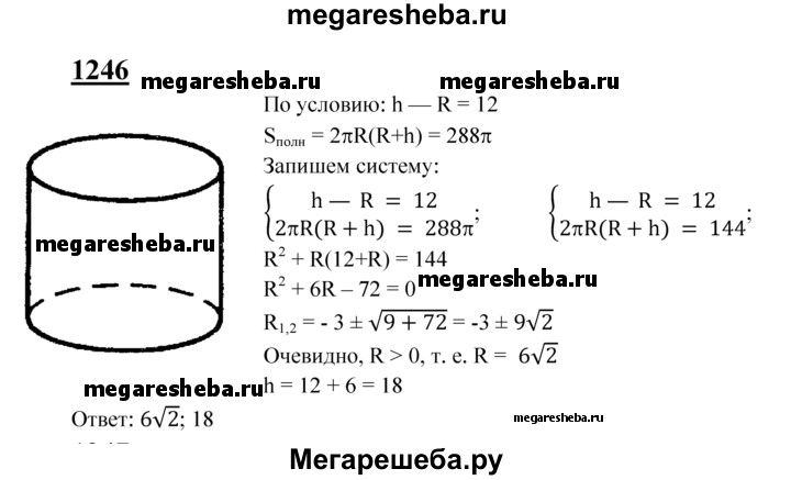1246 Высота цилиндра на 12 см больше его радиуса, а площадь полной поверхности равна 288л см2. Найдите радиус основания и высоту цилиндра.