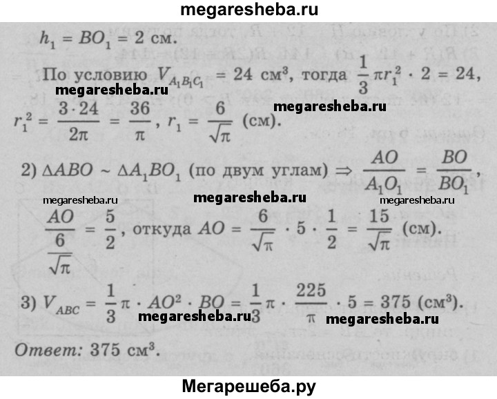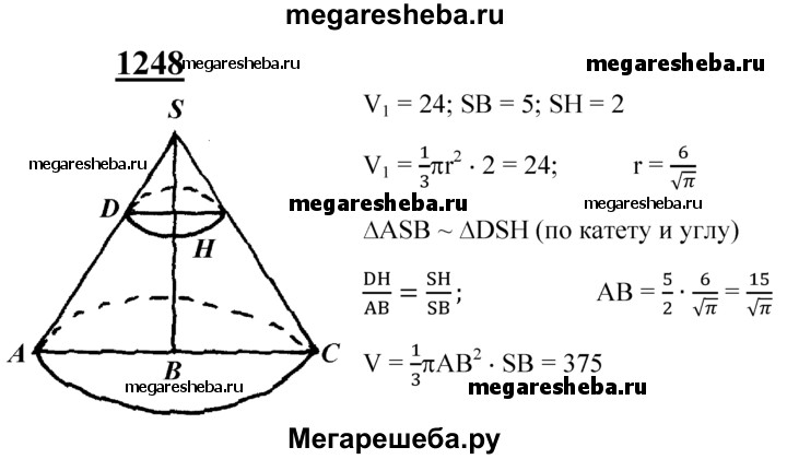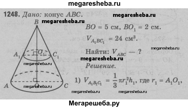 1248 Высота конуса равна 5 см. На расстоянии 2 см от вершины его пересекает плоскость, параллельная основанию. Найдите объём этого конуса, если объём отсекаемого от него конуса равен 24 см3.