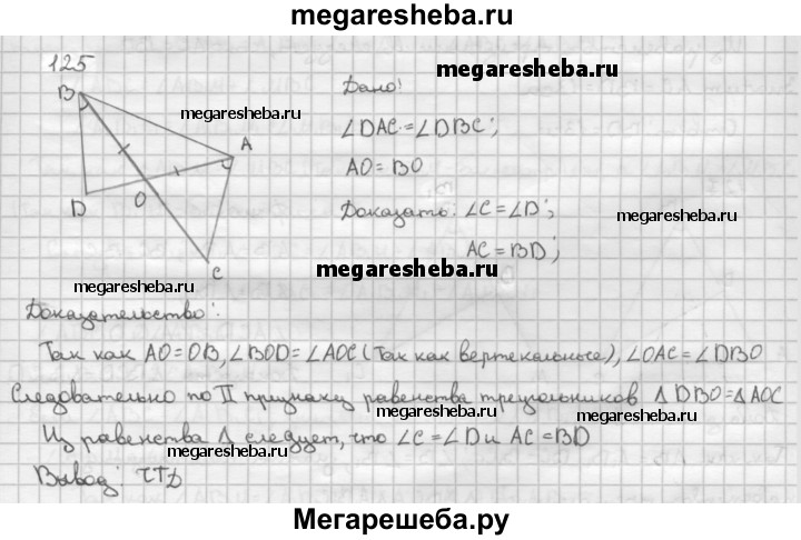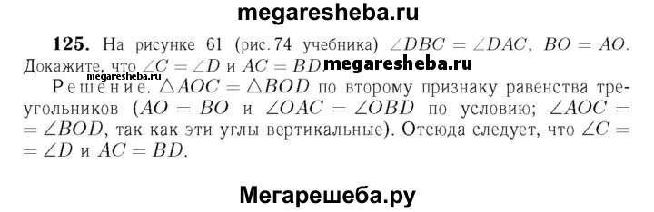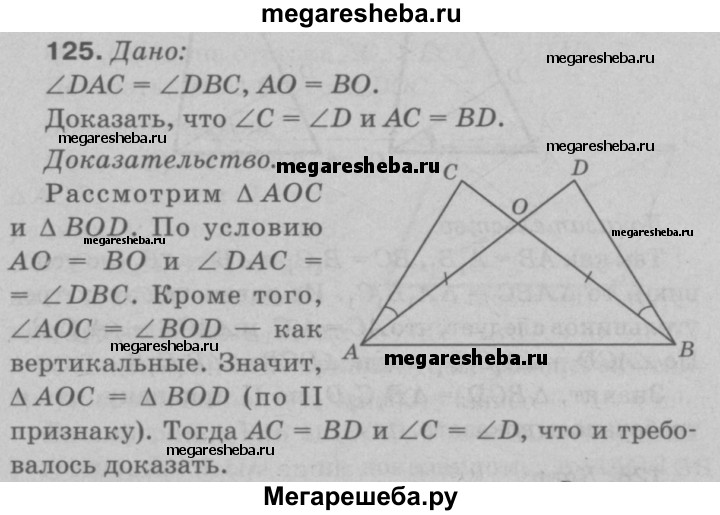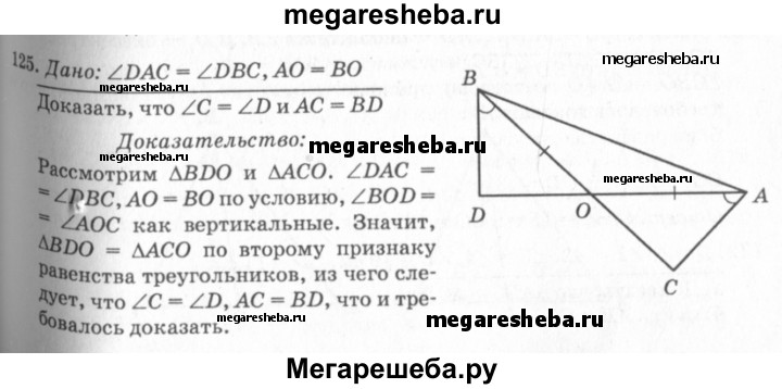 125 На рисунке 74 ∠DAC = ∠DBC, АО = ВО. Докажите, что ∠C = ∠D и АС = BD.