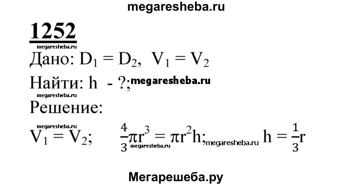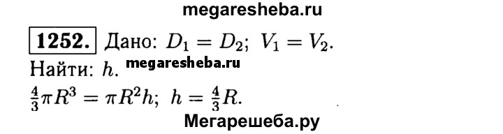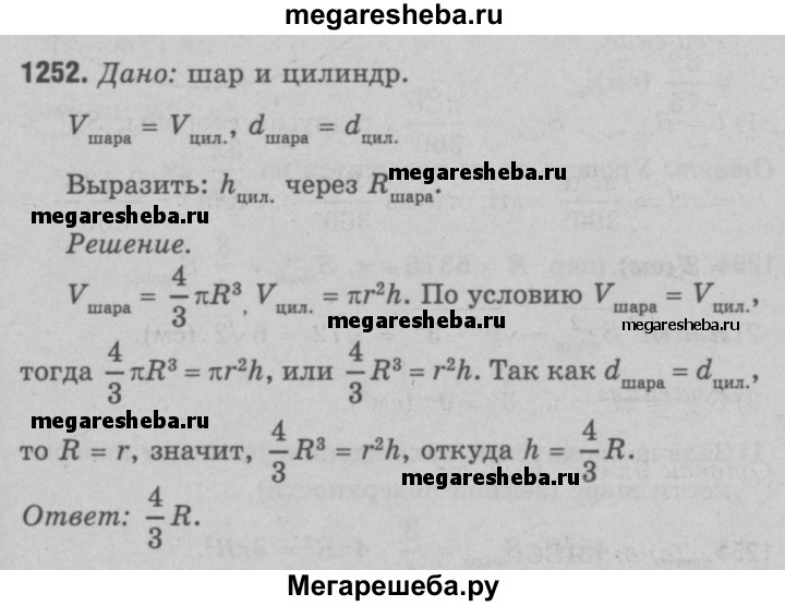 1252 Шар и цилиндр имеют равные объёмы, а диаметр шара равен диаметру цилиндра. Выразите высоту цилиндра через радиус шара.