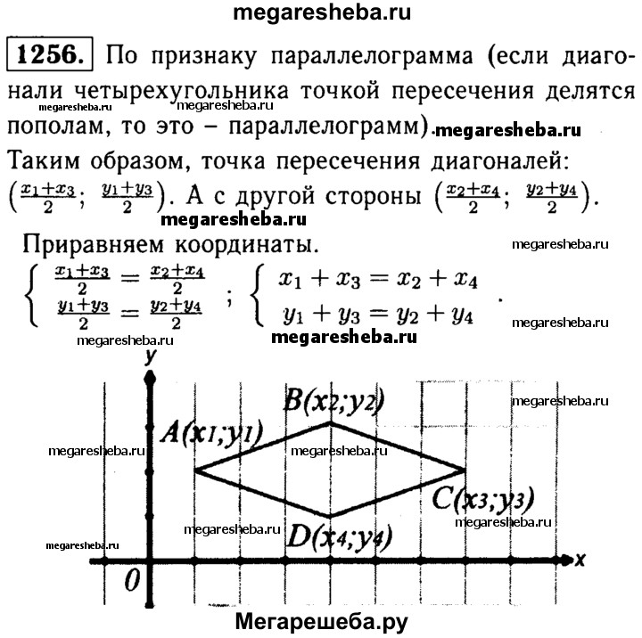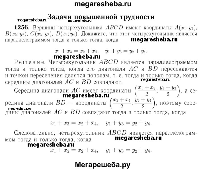 1256 Вершины четырёхугольника ABCD имеют координаты А (x1; у1), В (х2; у2), С (х3; у3) и D (x4; у4). Докажите, что этот четырёхугольник является параллелограммом тогда и только тогда, когда х1 + х3 = х2 + х4 и у1 + у3 = у2 + у4.