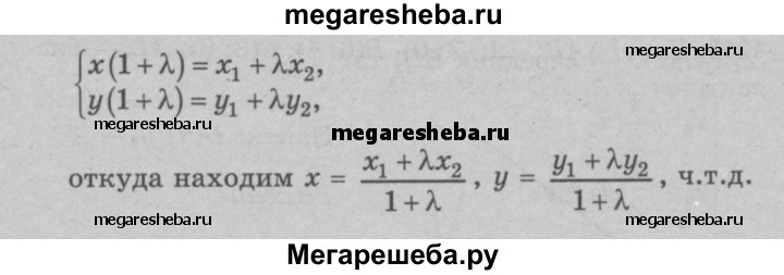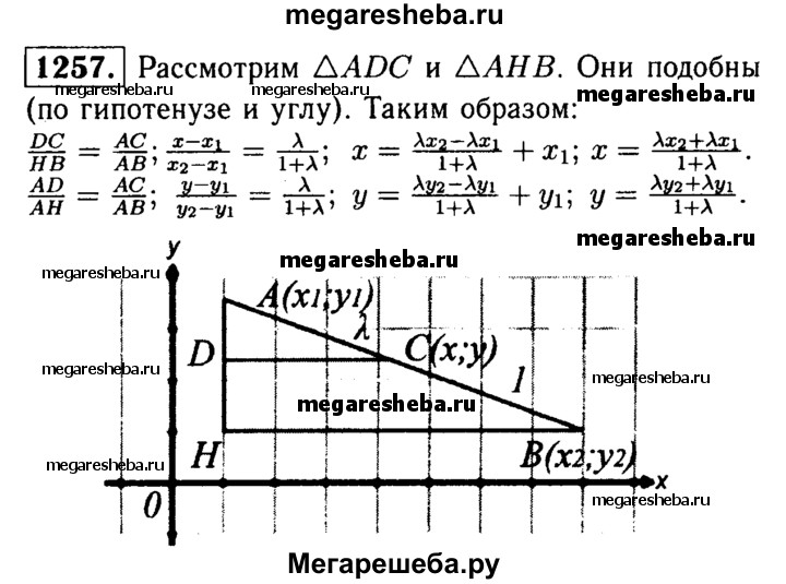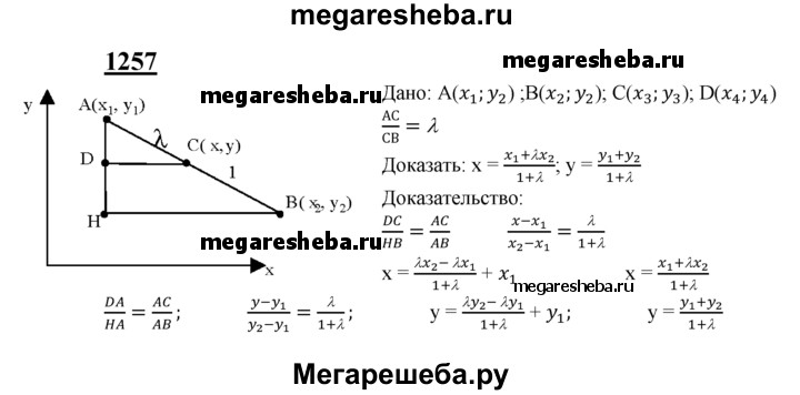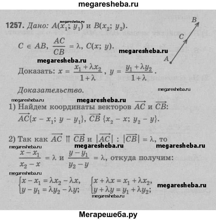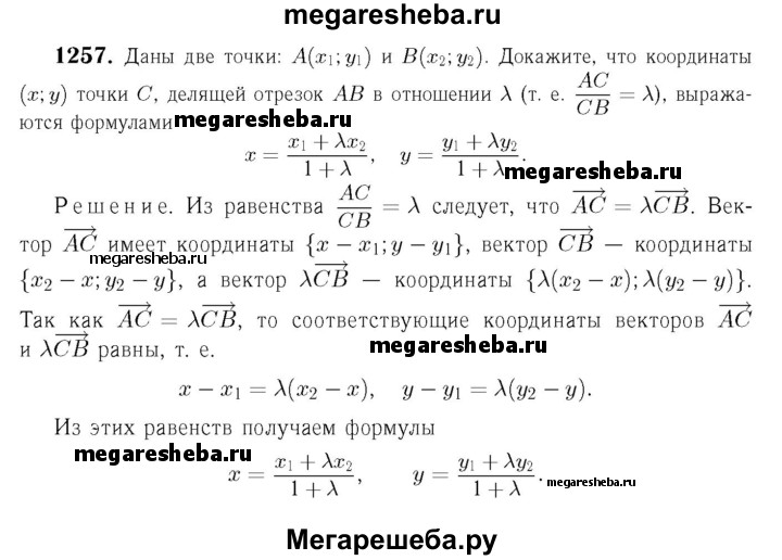 1257 Даны две точки А(х1; у1) и В (х2; у2). Докажите, что координаты (x; у) точки С, делящей отрезок АВ в отношении λ (т.е. AC/CB = λ ), выражаются формулами z = x1+ λ x2/ 1 + λ = y1 + λy2 / 1 + λ