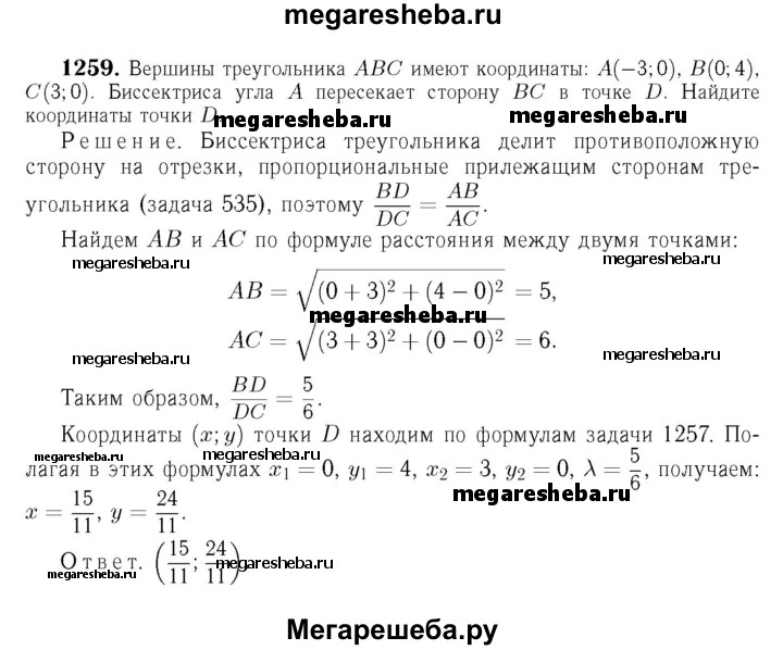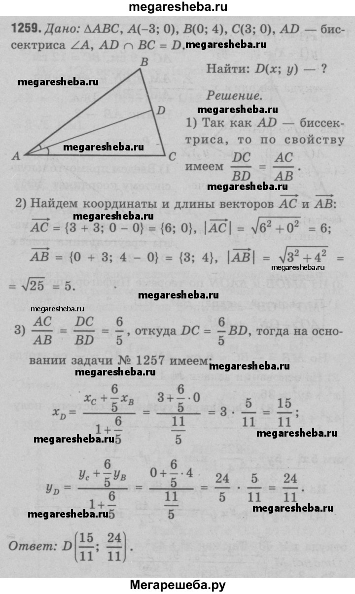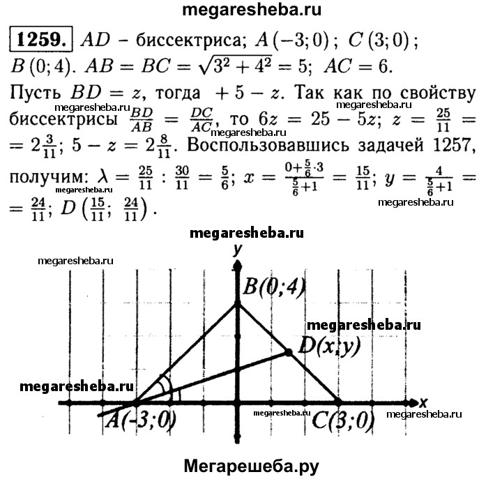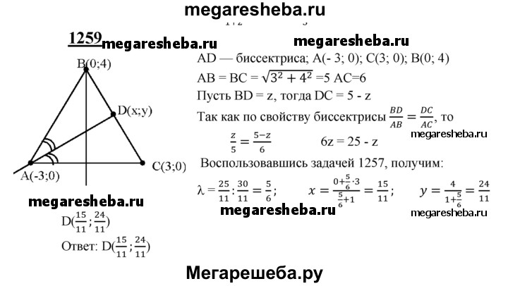 1259 Вершины треугольника ABC имеют координаты А (-3; 0), В (0; 4), С (3; 0). Биссектриса угла А пересекает сторону ВС в точке D. Найдите координаты точки D.