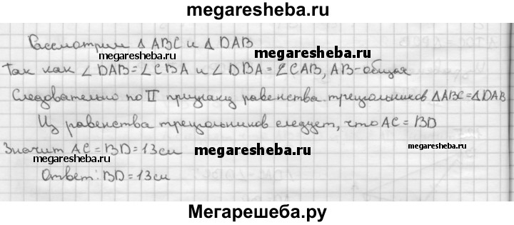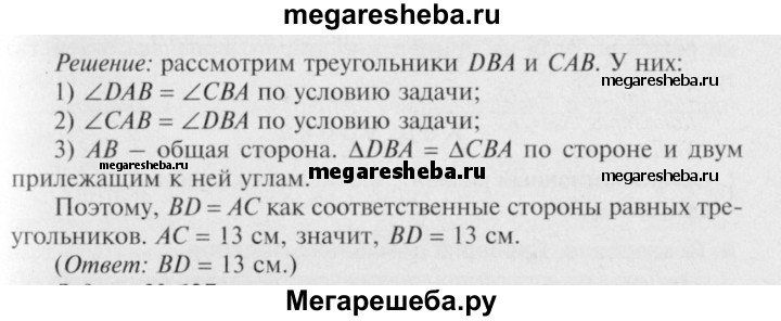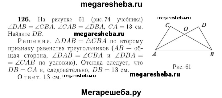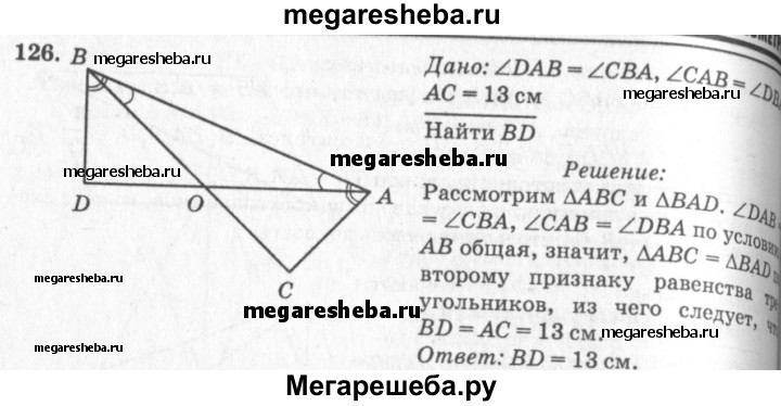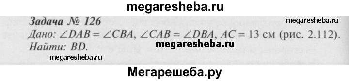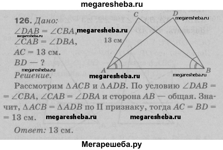 126 На рисунке 74 ∠DAB = ∠CBA, ∠CAB = ∠DBA, АС=13см. Найдите BD.