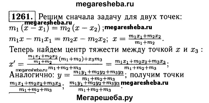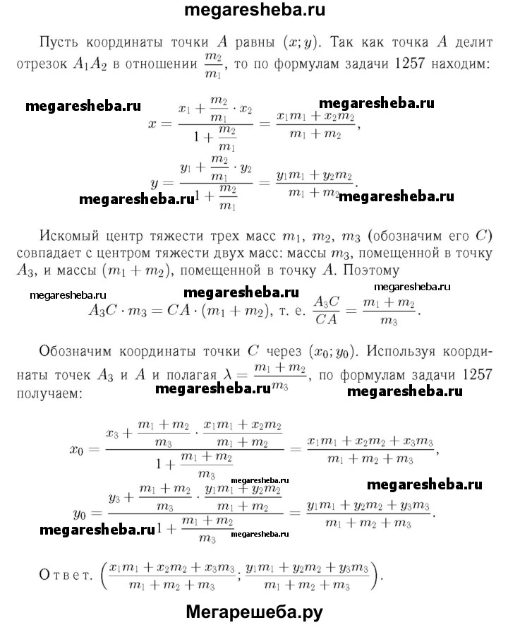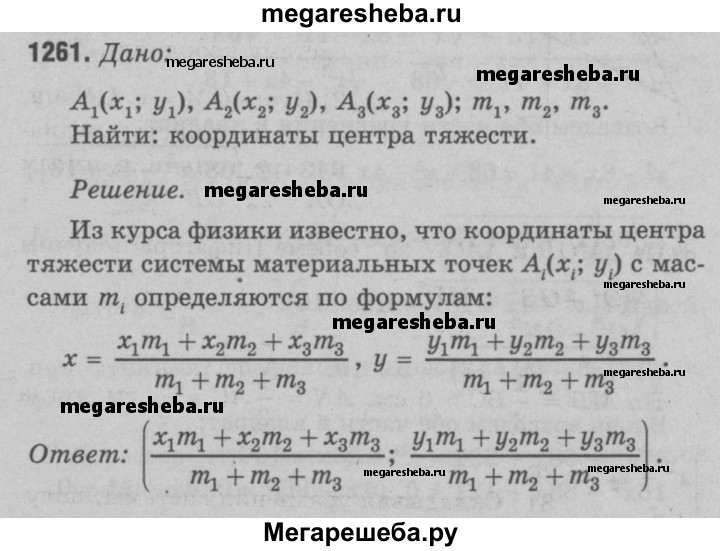 1261 Найдите координаты центра тяжести системы трёх масс т„ т2 и т3, сосредоточенных соответственно в точках А1 (х1; у1), А2 (х2; у2), А3 (х3; у3).