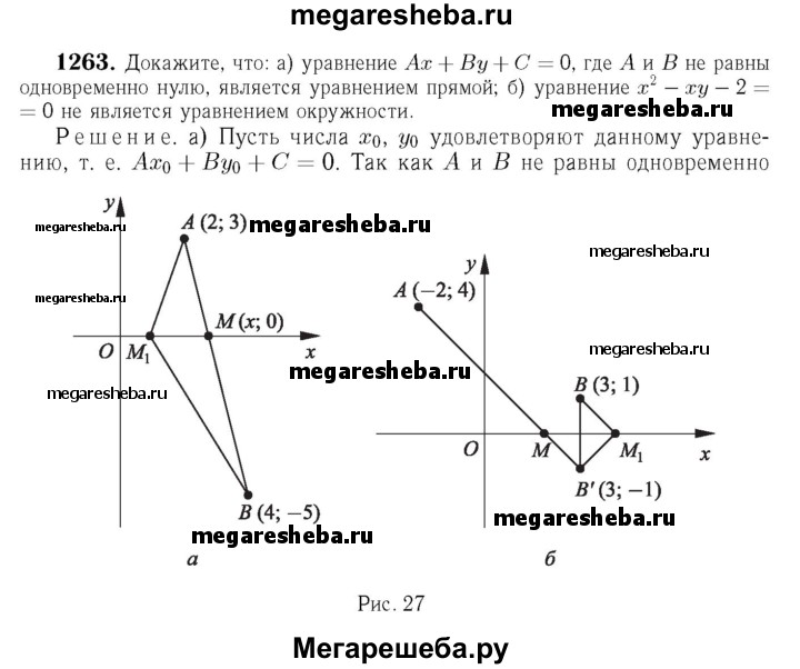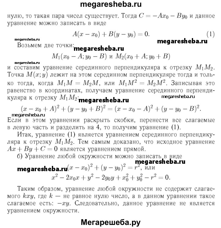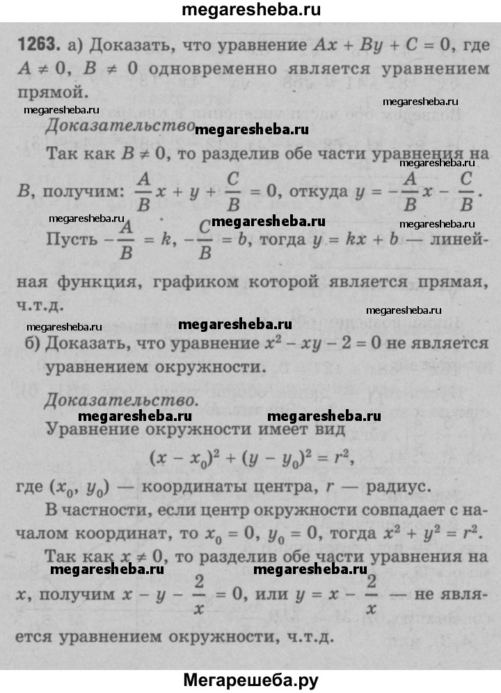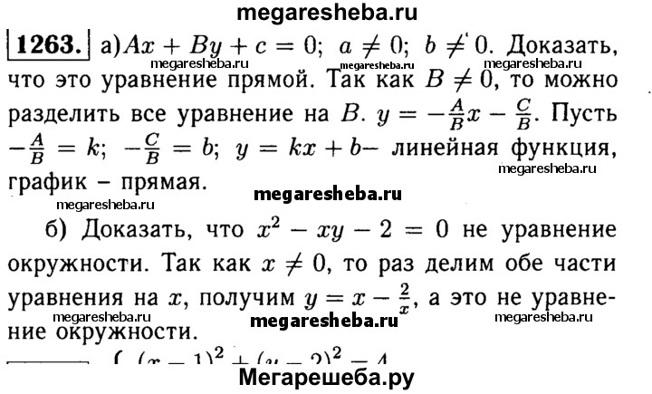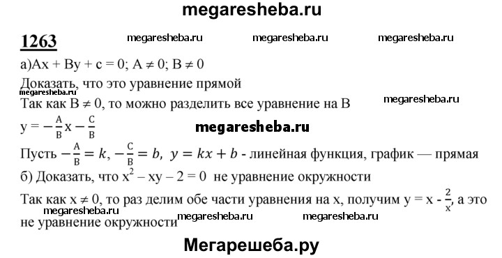 1263 Докажите, что: а) уравнение Ах + By + С = 0, где А и В одновременно не равны нулю, является уравнением прямой; б) уравнение х2 - ху - 2 = 0 не является уравнением окружности.